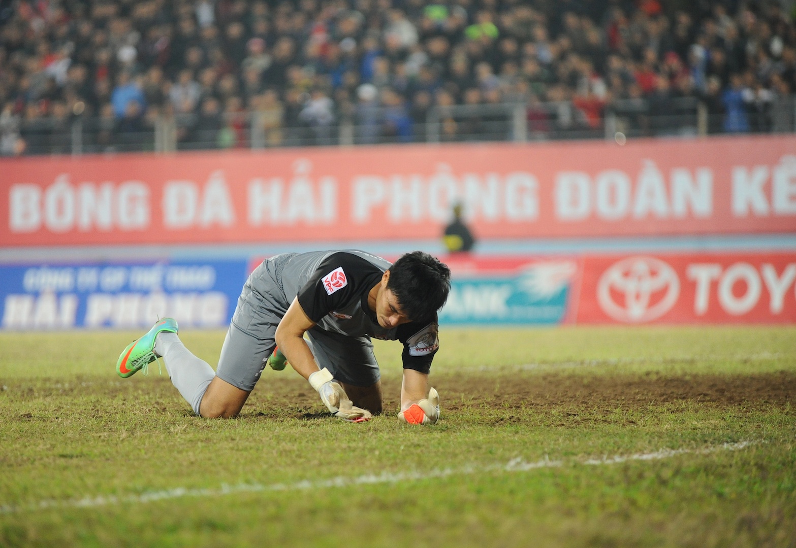 | Thủ môn Xuân Việt của CLB Hải Phòng cũng là người phải hứng chịu nhiều tình huống bóng khó lường khi mặt sân xấu khiến bóng đi với quỹ đạo rất khó đoán. |