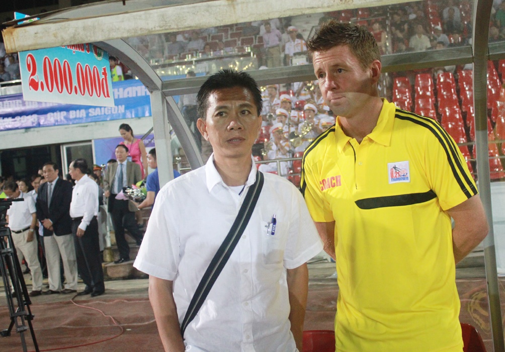 | Chuyên gia thể lực của V.Hải Phòng Dylan Kerr là thuyền trưởng của đội U21. HLV Hoàng Anh Tuấn đứng đằng sau giúp đỡ trợ lý của mình. |