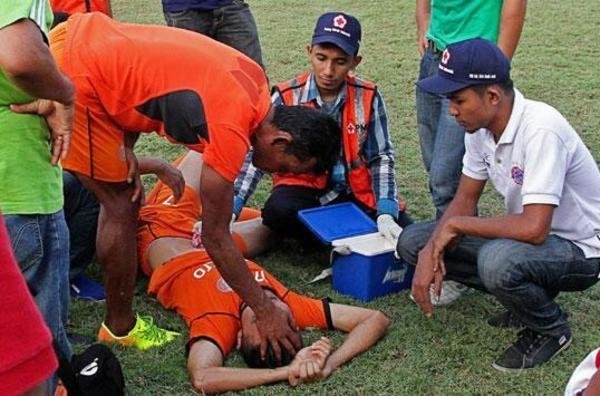 | Akli Fairuz bị nội thương sau pha đạp bóng của thủ môn đối phương. Ảnh: ESPN |