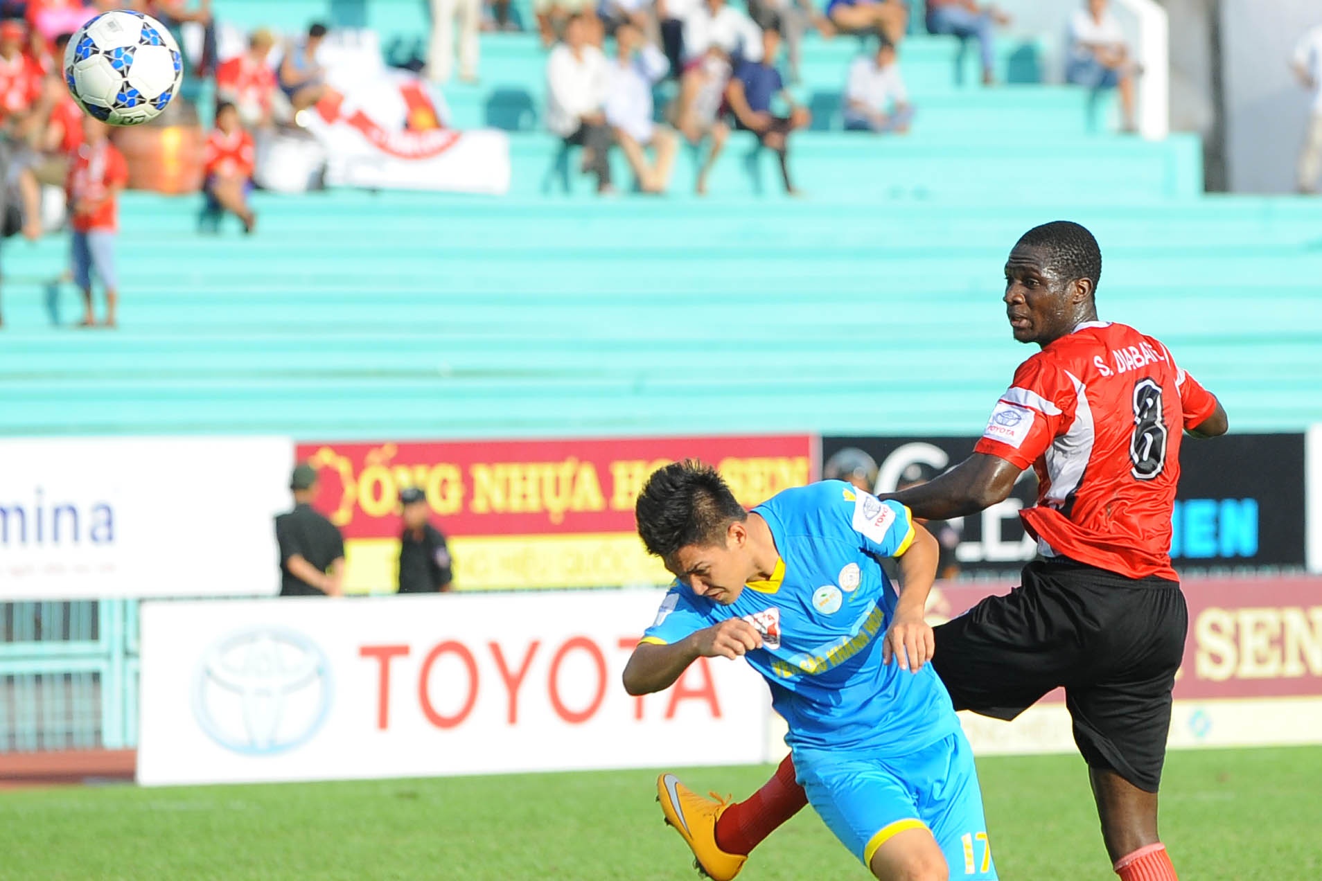 | Ở phút 45, trọng tài chính Trần Đình Thịnh bắt lỗi các hậu vệ Khánh Hòa trong pha bóng tranh chấp trên không với tiền đạo Diabate (ĐTLA). |