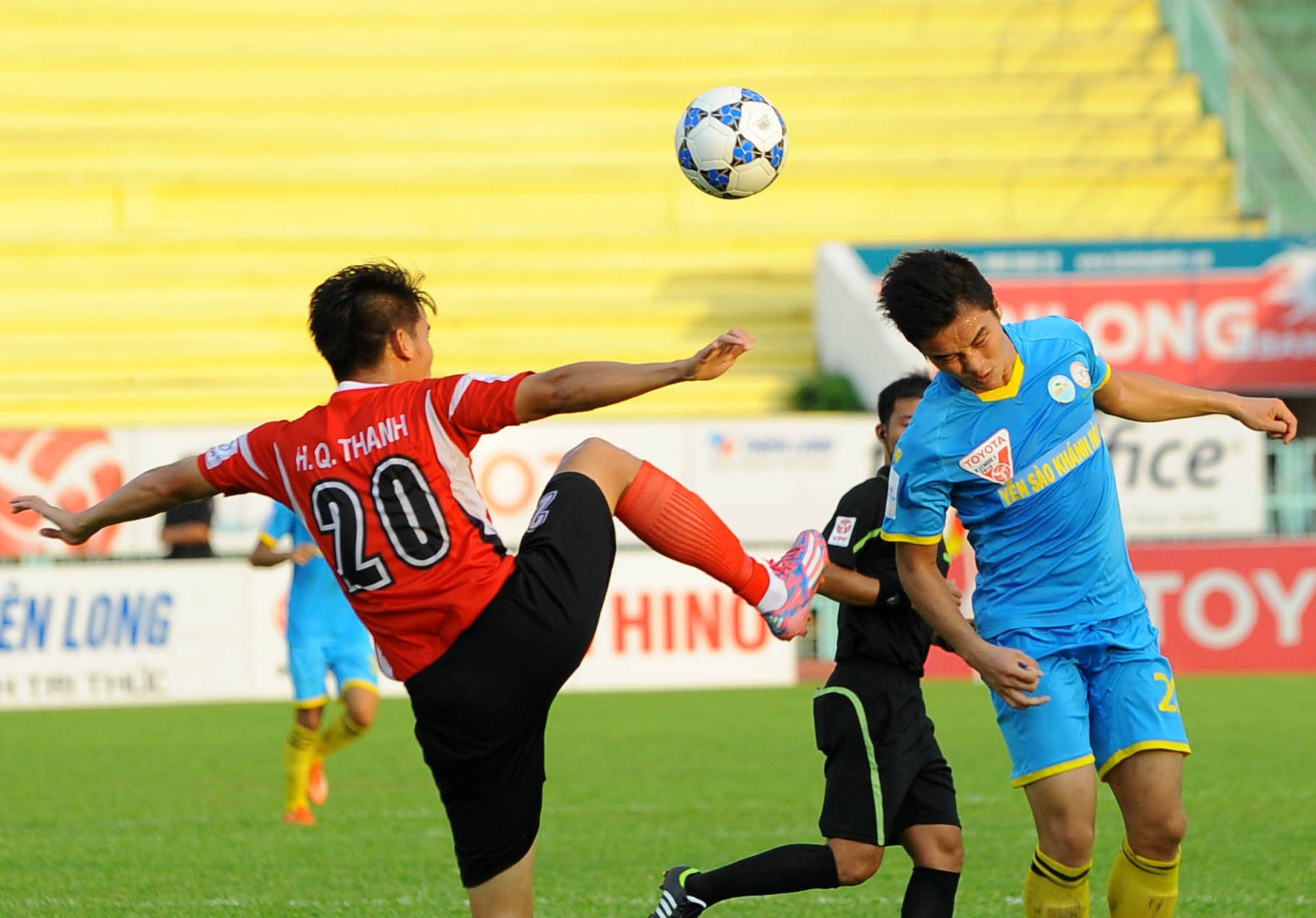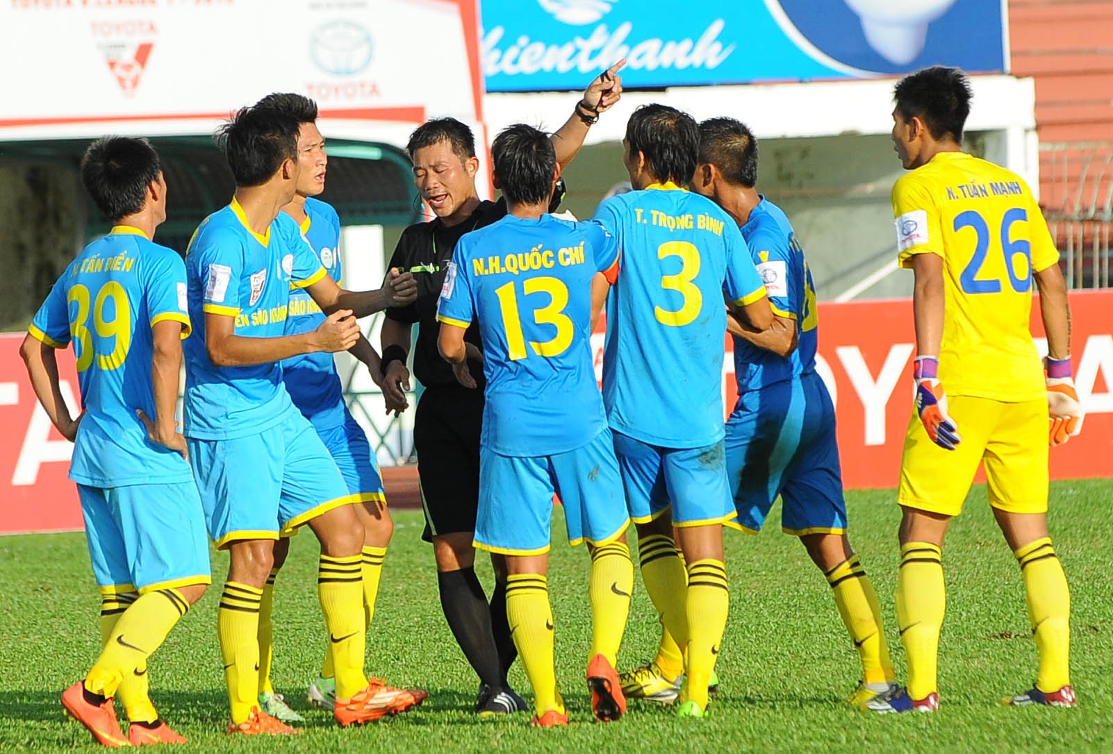 | Khánh Hòa thất thủ 0-2 trong chuyến làm khách trước đội chủ nhà ĐTLA. Các cầu thủ đội bóng phố biển đã vây trọng tài để phản ứng quyết định thổi phạt đền cho đội chủ nhà sau pha bóng không rõ ràng ở cuối hiệp 1. |