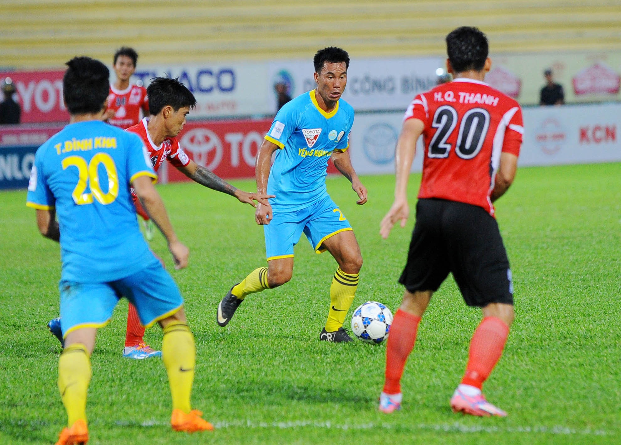| Các cầu thủ Khánh Hòa chủ động tấn công vào trung lộ để tìm cơ hội nhưng đều không qua được các chốt chặn nơi hàng hậu vệ của đội chủ nhà. |