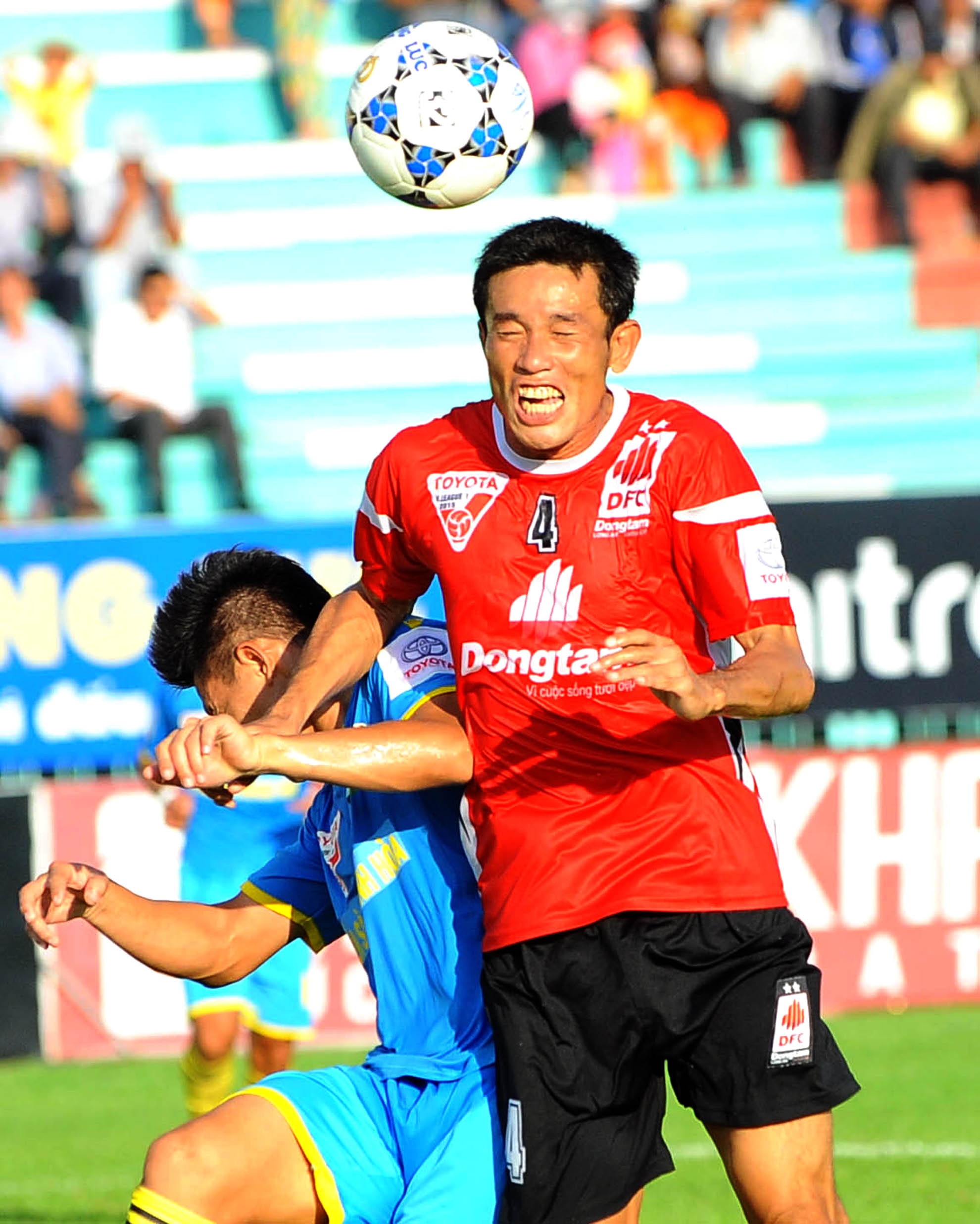 | Về cuối trận, các cầu thủ Khánh Hòa dồn toàn lực lên tấn công nhằm tìm kiếm bàn thắng. |