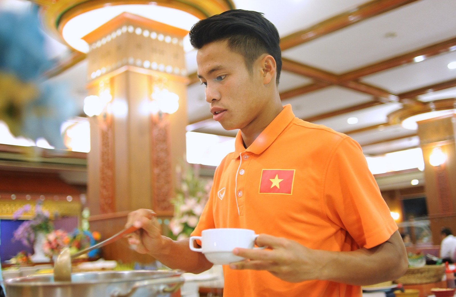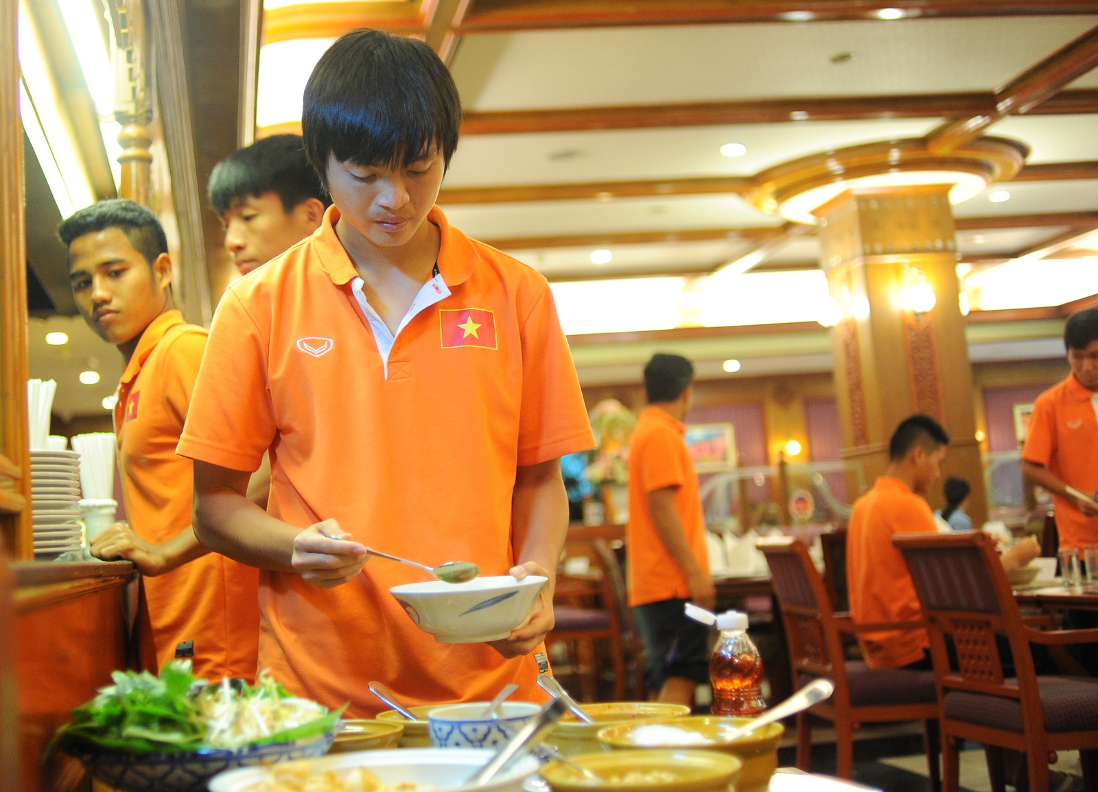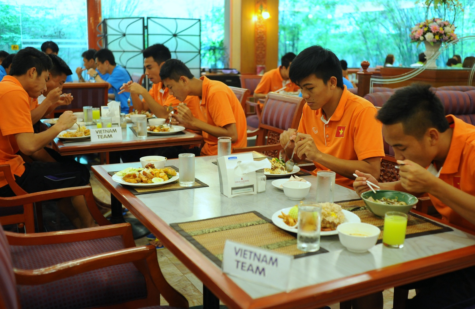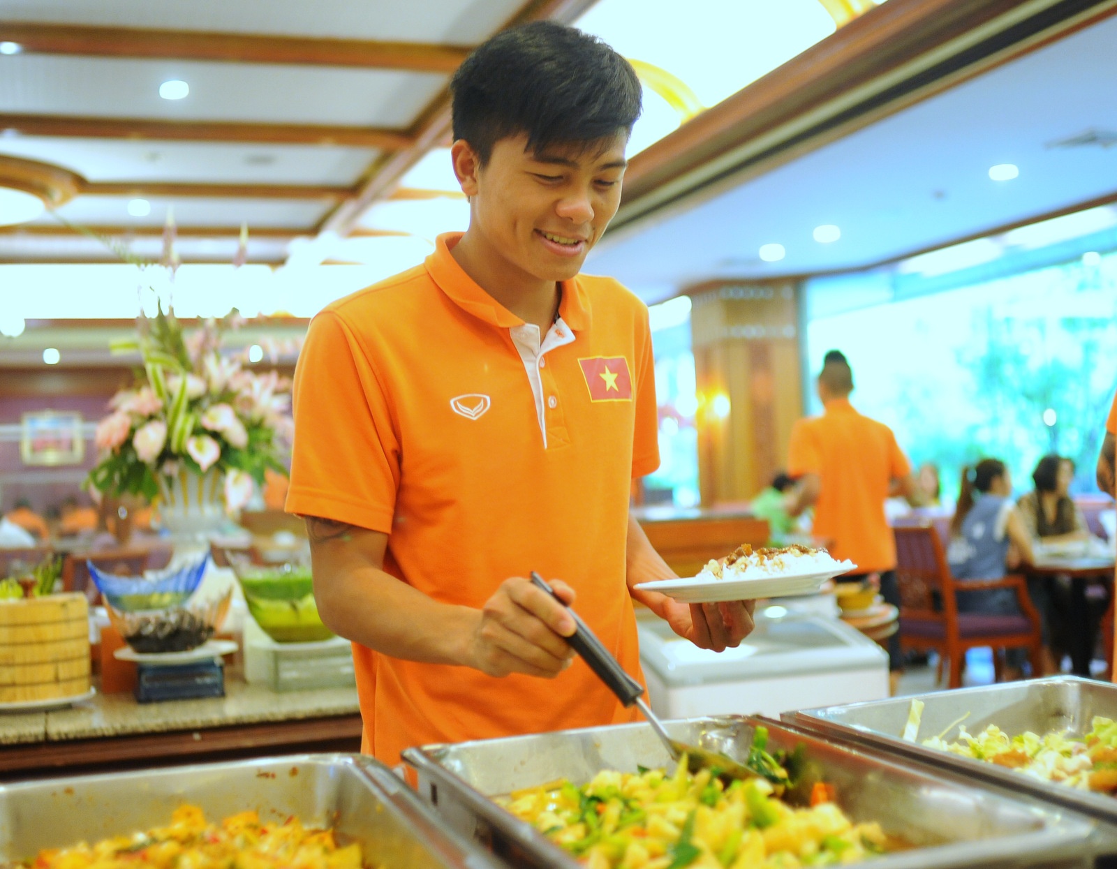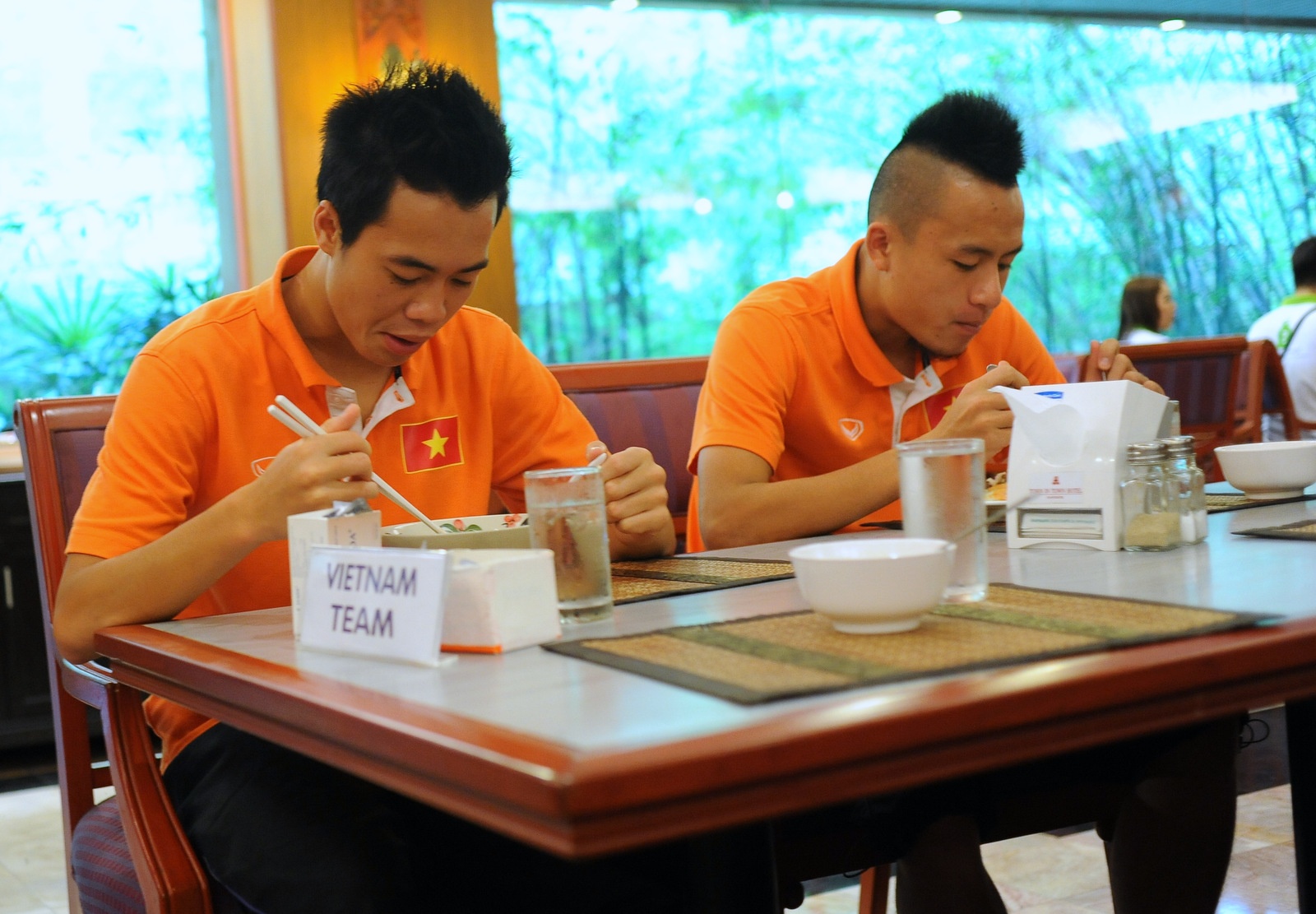 | Đội trưởng Quế Ngọc Hải và thủ môn Hoài Anh cảm thấy ngon miệng khi dùng bữa tại khách sạn 4 sao. Anh cùng toàn đội hy vọng rằng khách sạn Olympic Việt Nam ở tại Malaysia cũng có những món hợp khẩu vị như Thái Lan. |