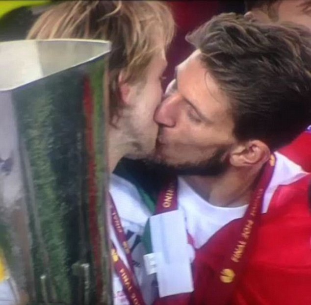 | Màn khóa môi đồng tính gây tranh cãi của Ivan Rakitic và Daniel Carrico. |