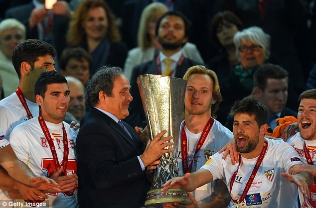 | Thầy trò đội tuyển Sevilla phấn khích nâng cao Cúp vô địch Europa League. |
