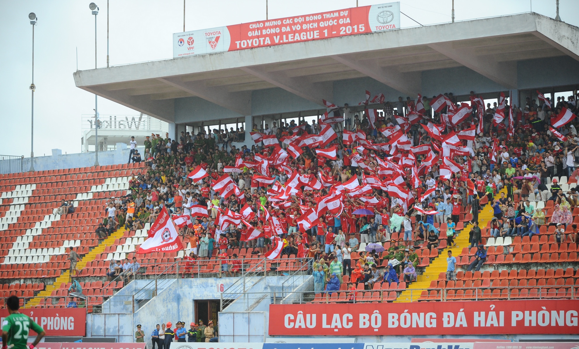 | Khán đài B sân Lạch Tray rợp màu cờ trắng - đỏ sau bàn thắng mở tỷ số của Văn Nhiên. |