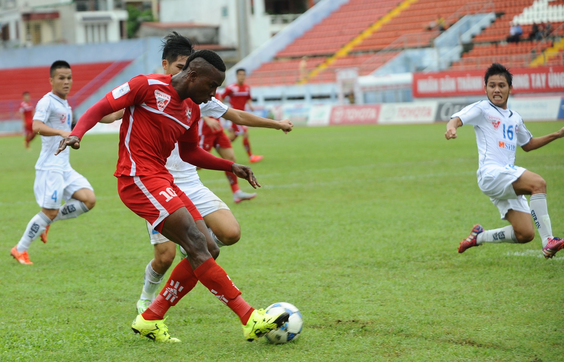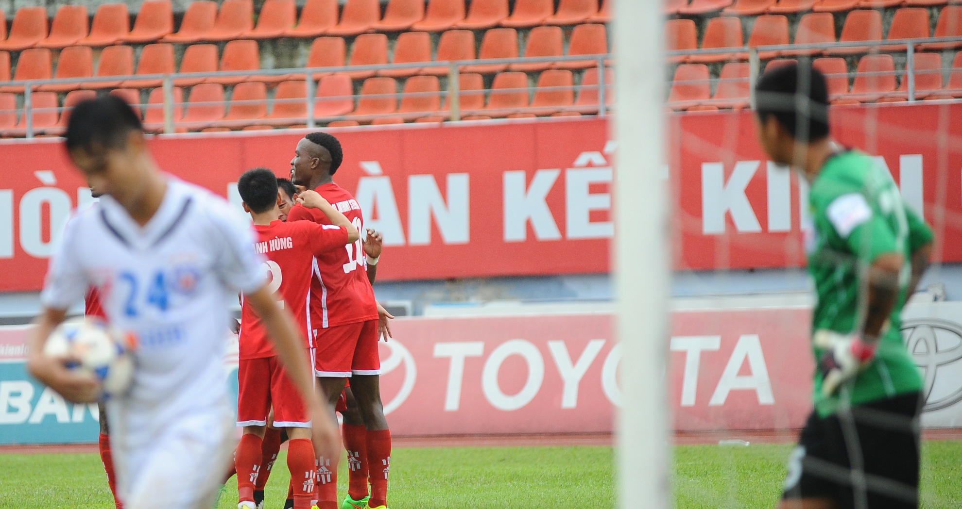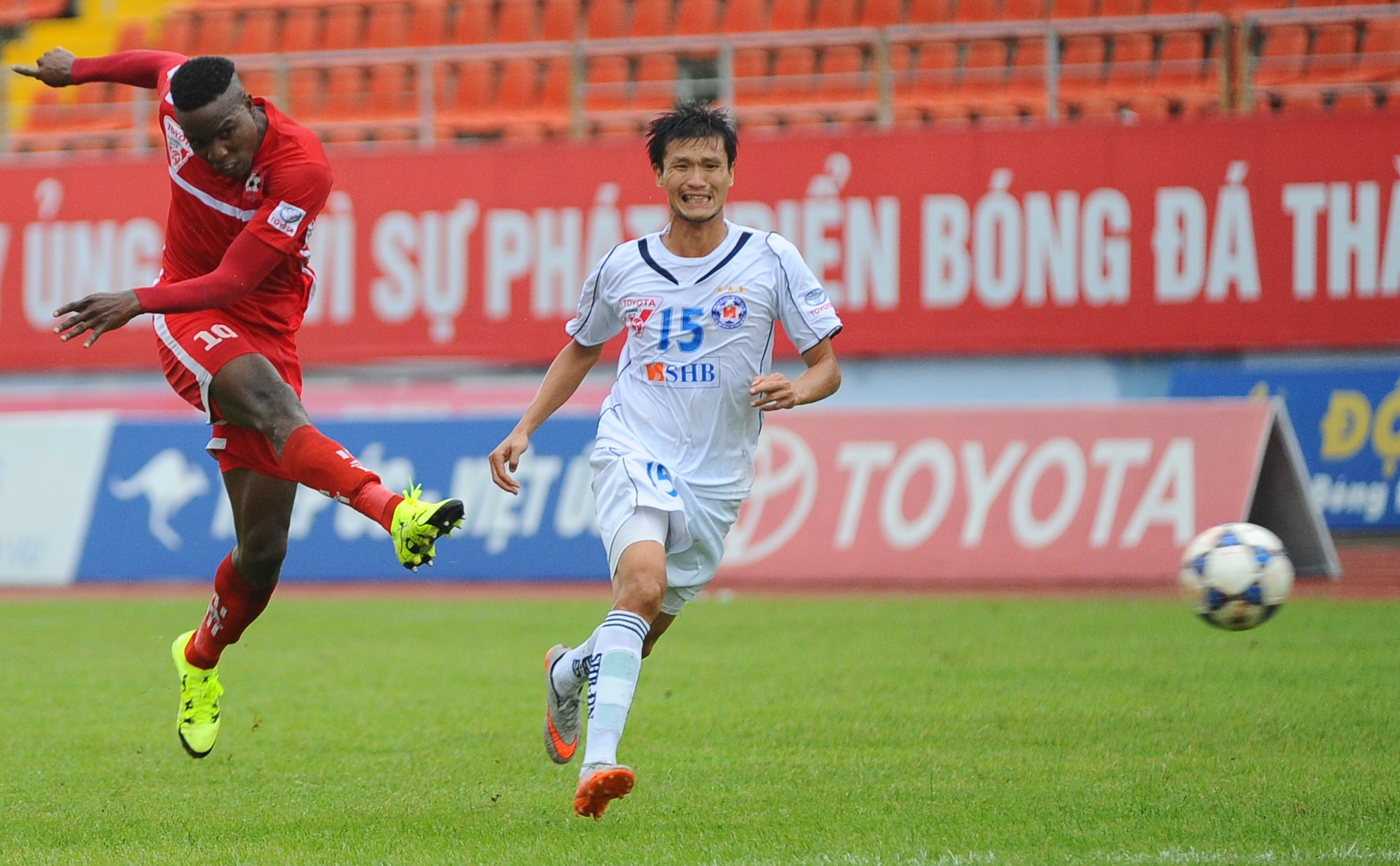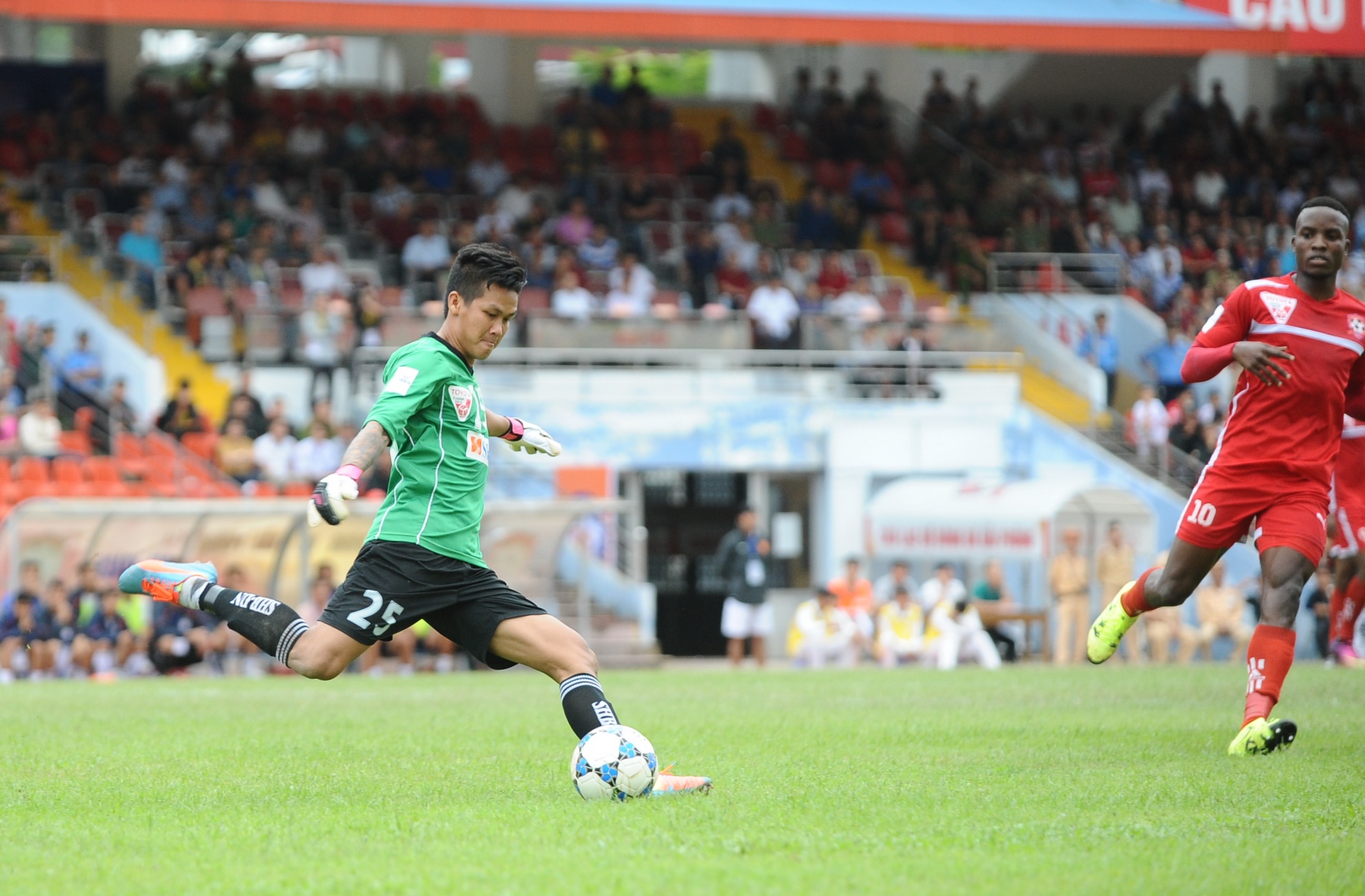 | Thủ môn Lê Văn Hưng của Đà Nẵng có nhiều pha băng lên hỗ trợ hàng thủ phá bóng trước sự nhanh nhẹn của Stevens. |