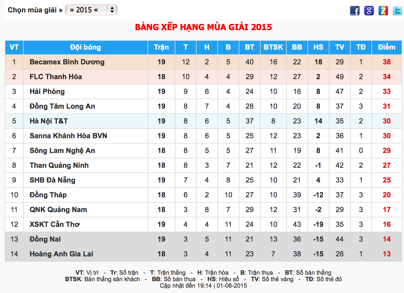 | Bảng xếp hạng V.League 2015 tạm thời tính đến tối ngày 1/8. |