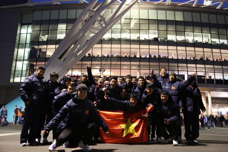 | Các cầu thủ U19 mang theo cờ Việt Nam tới sân vận động Wembley - sân có kinh phí xây dựng lớn nhất thế giới: 889 triệu bảng. |