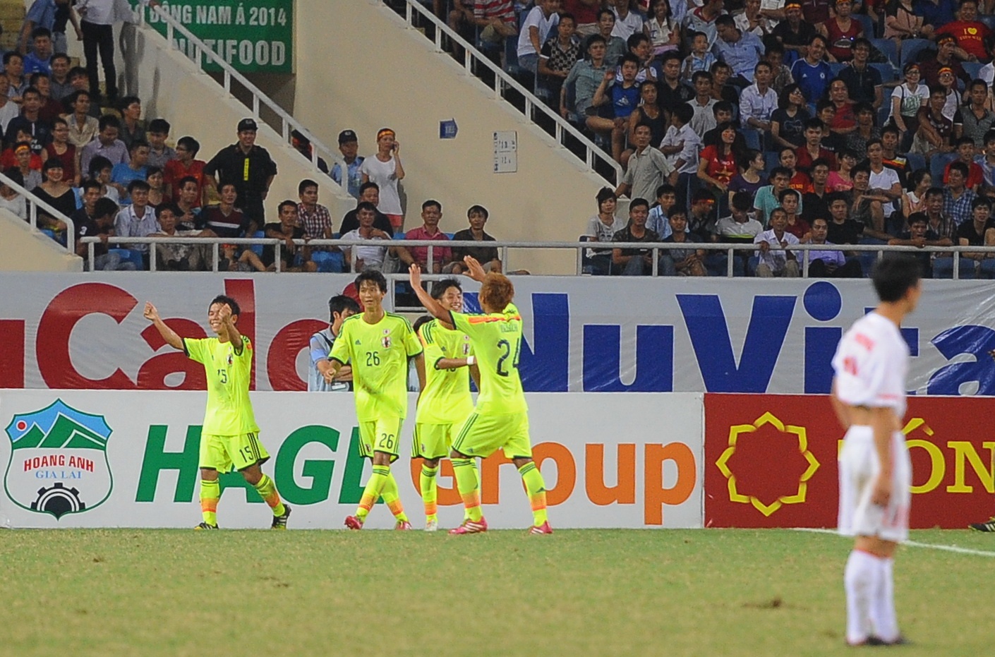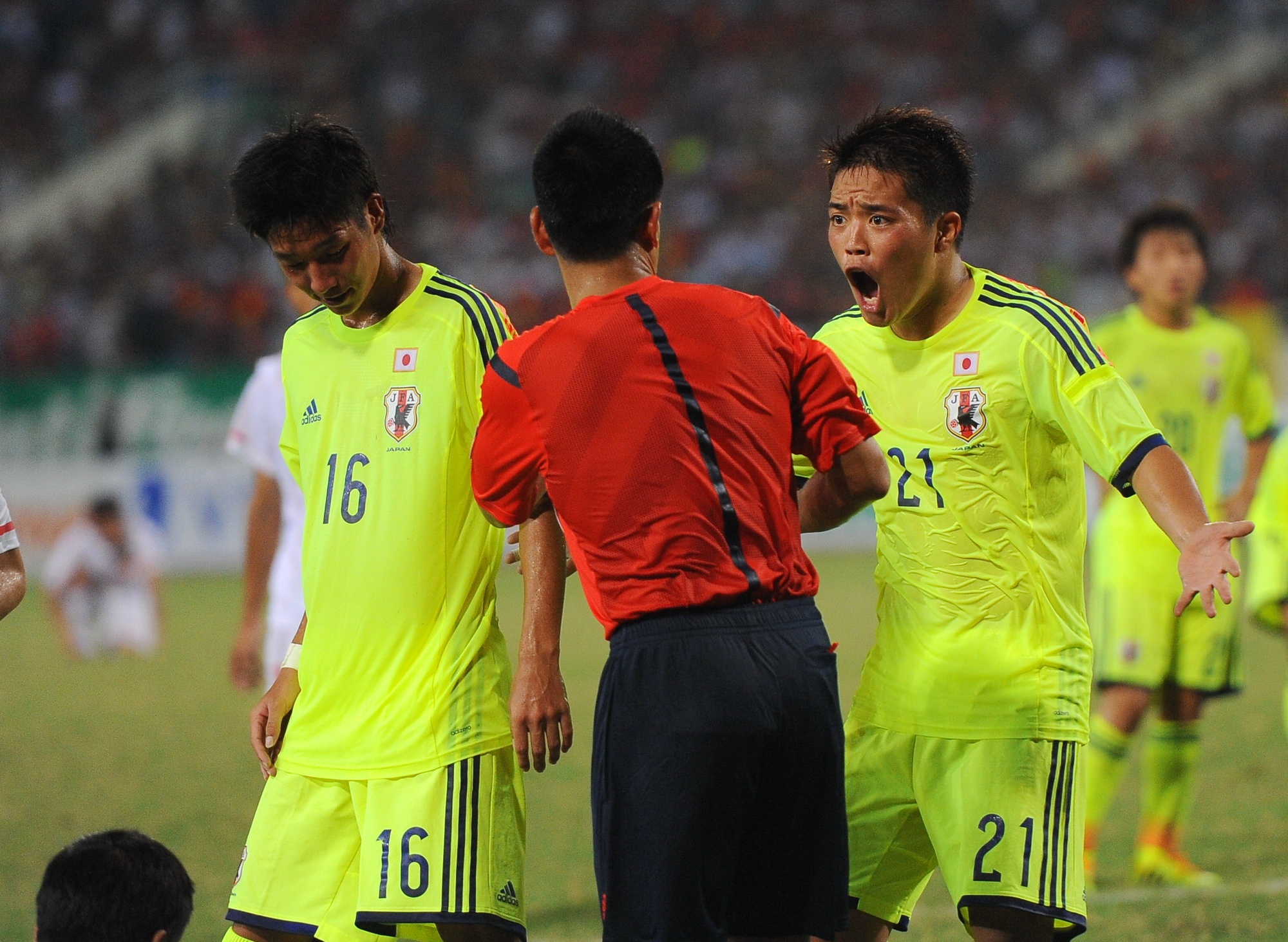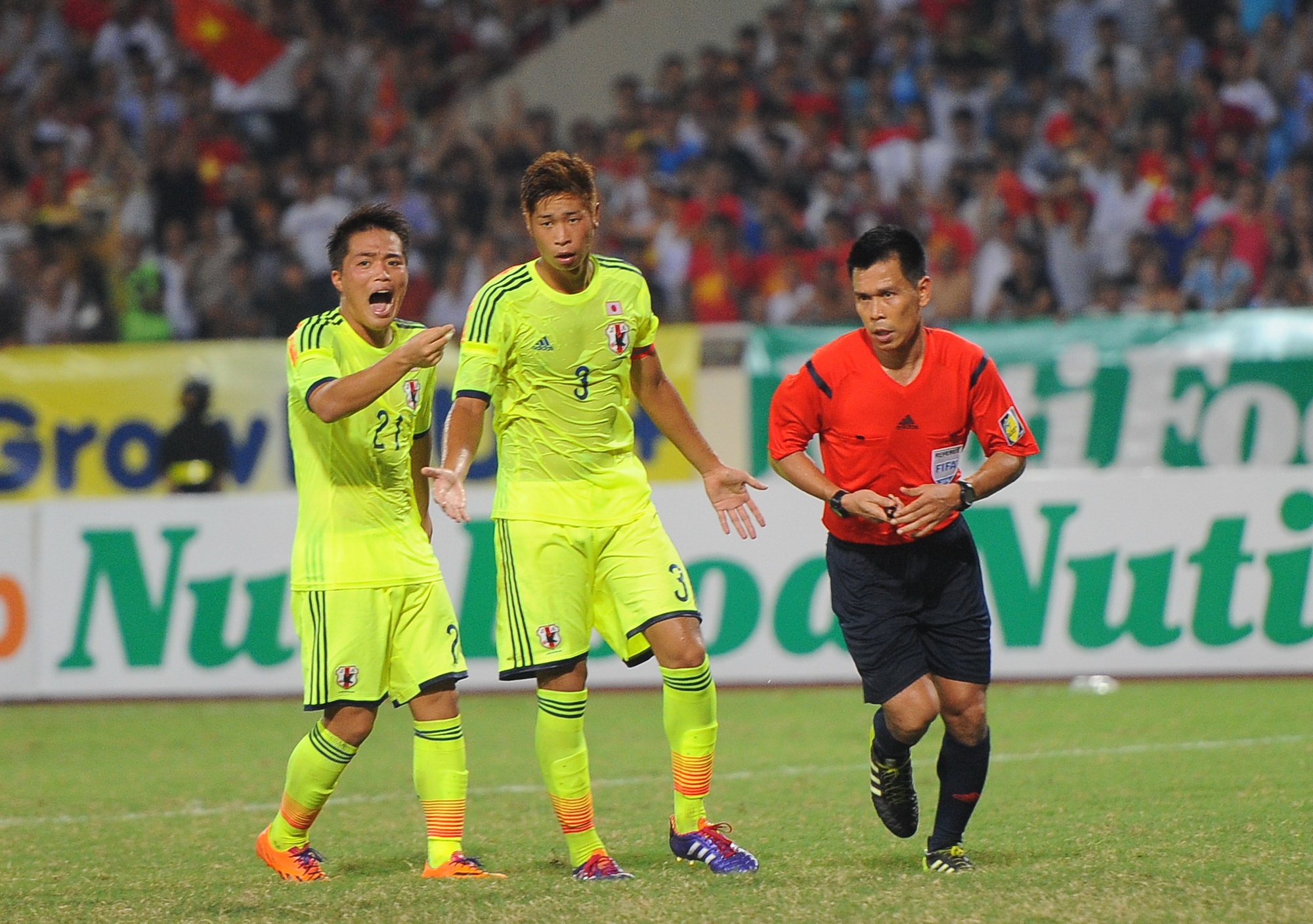| Cầu thủ Takagi Daisuke (số 21) và đội trưởng Miura Genta phản ứng với trọng tài sau khi ông này thổi phạt tình huống phạm lỗi của hậu vệ U19 Nhật Bản với Văn Toàn. |