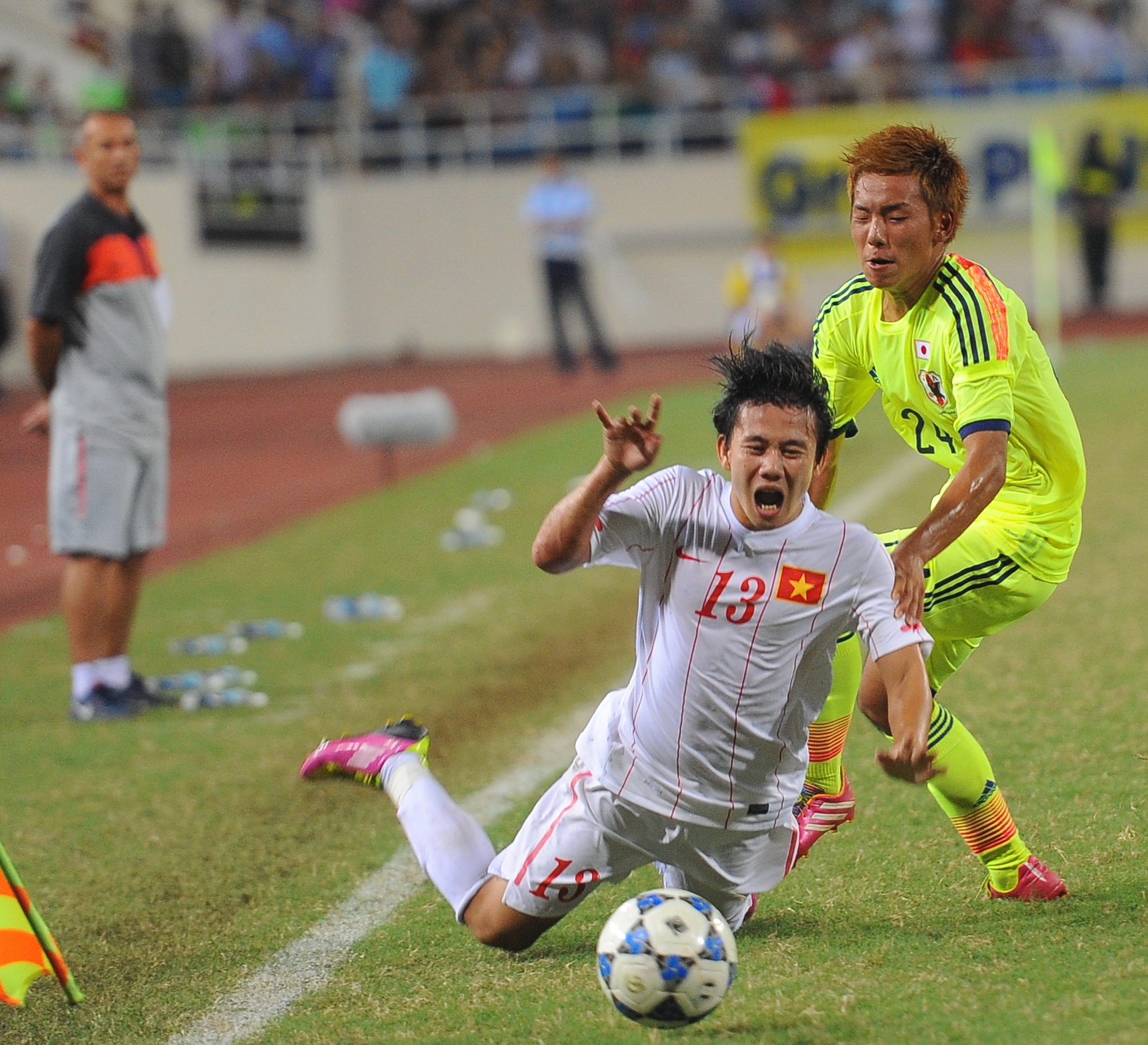 | Tình huống kéo áo Văn Long của cầu thủ Sakai Daisuke. |