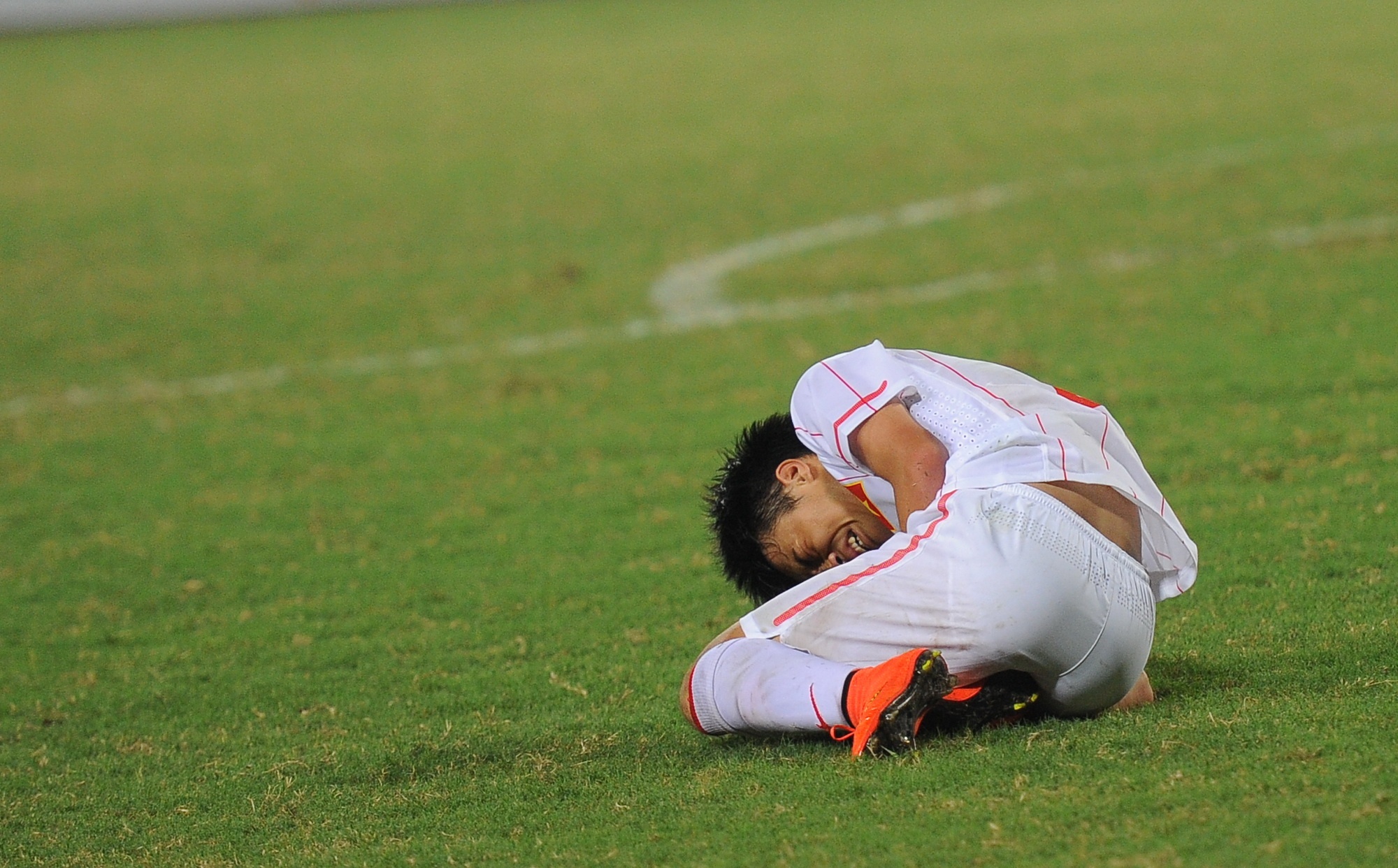 | Trong khi đó Văn Toàn đang oằn mình chịu đựng đau đớn trên sân, bác sĩ Hoàng Nghĩa Dương chưa được sự cho phép của trọng tài chính nên không thể vào sân chăm sóc tiền đạo số 9 của U19 Việt Nam. |
