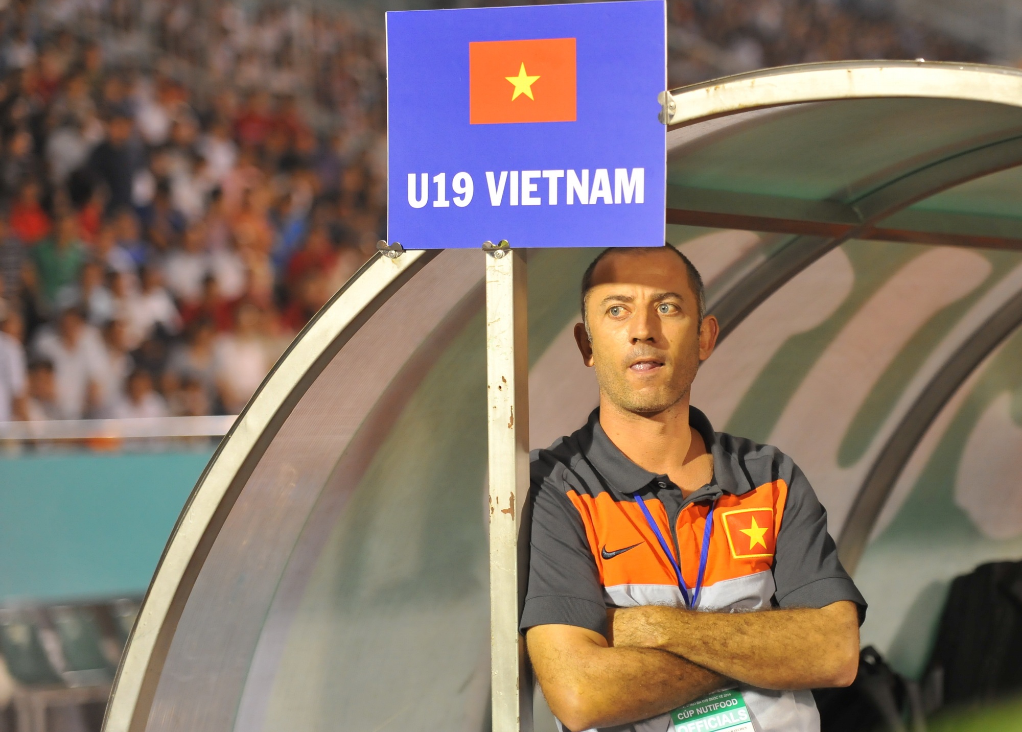 | HLV Guillaume Graechen quan sát trận đấu rất chăm chú để có những điều chỉnh kịp thời sau khi U19 Việt Nam bị dẫn trước 1-0. |