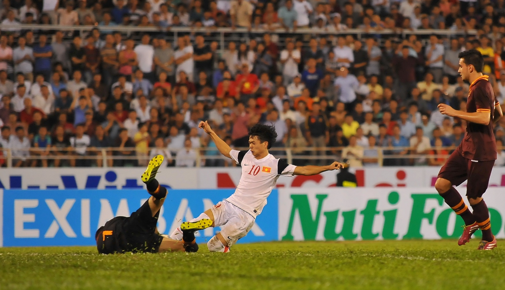 | Sau khi sút bóng dội cột dọc, Công Phượng lại có pha đi bóng qua thủ môn Lorenzo đầu hiệp 1. |