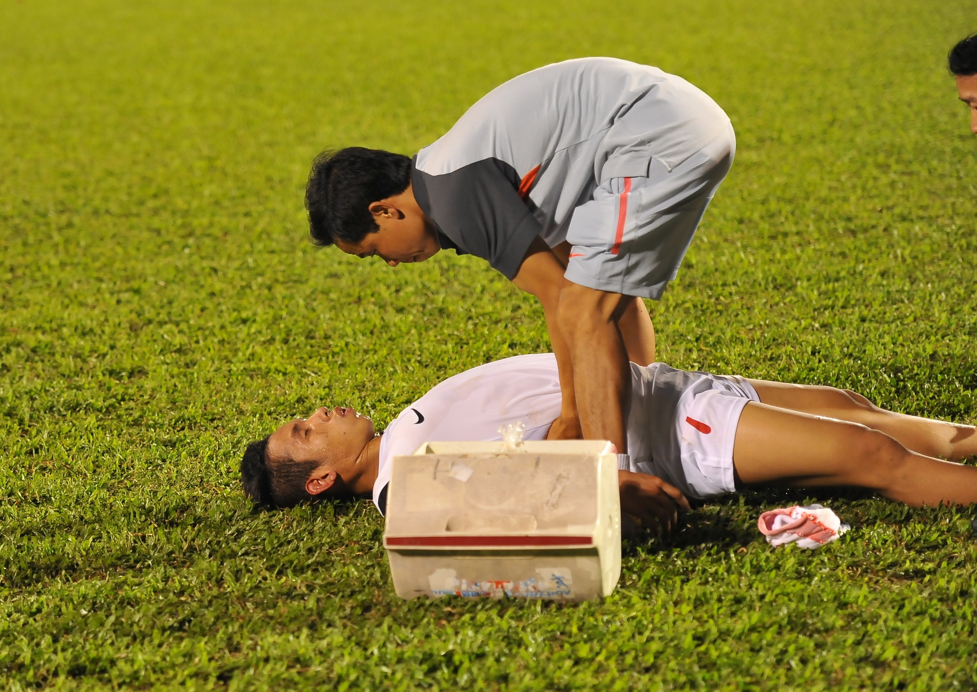 | Cuối trận, một cầu thủ U19 Việt Nam bị đuối sức nằm gục dưới sân khiến bác sĩ phải khẩn cấp vào sân sơ cứu. |