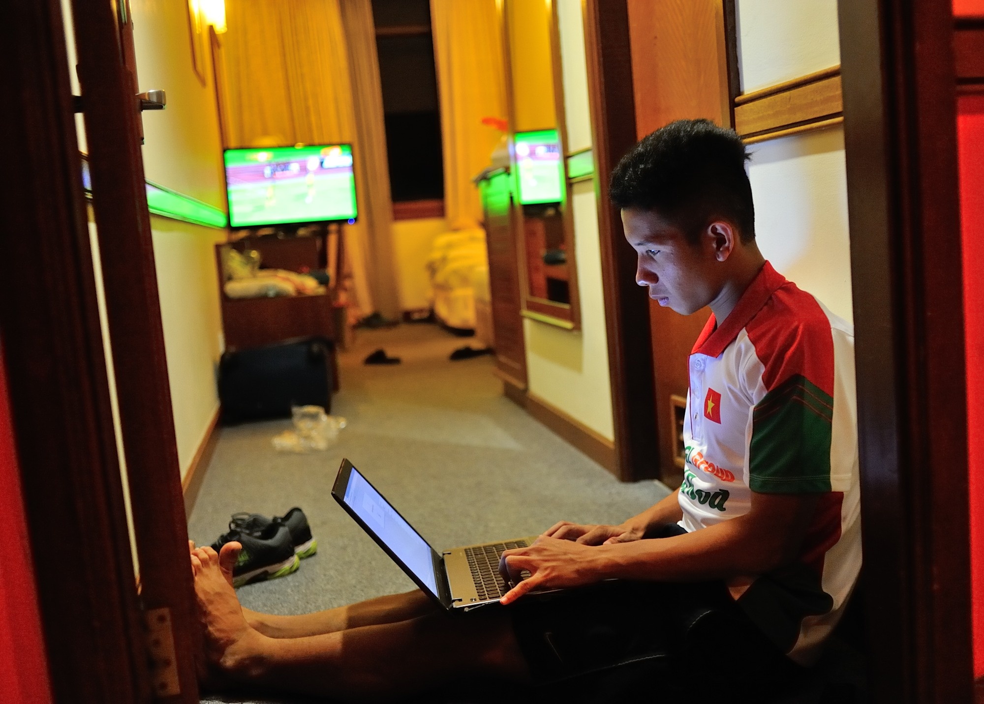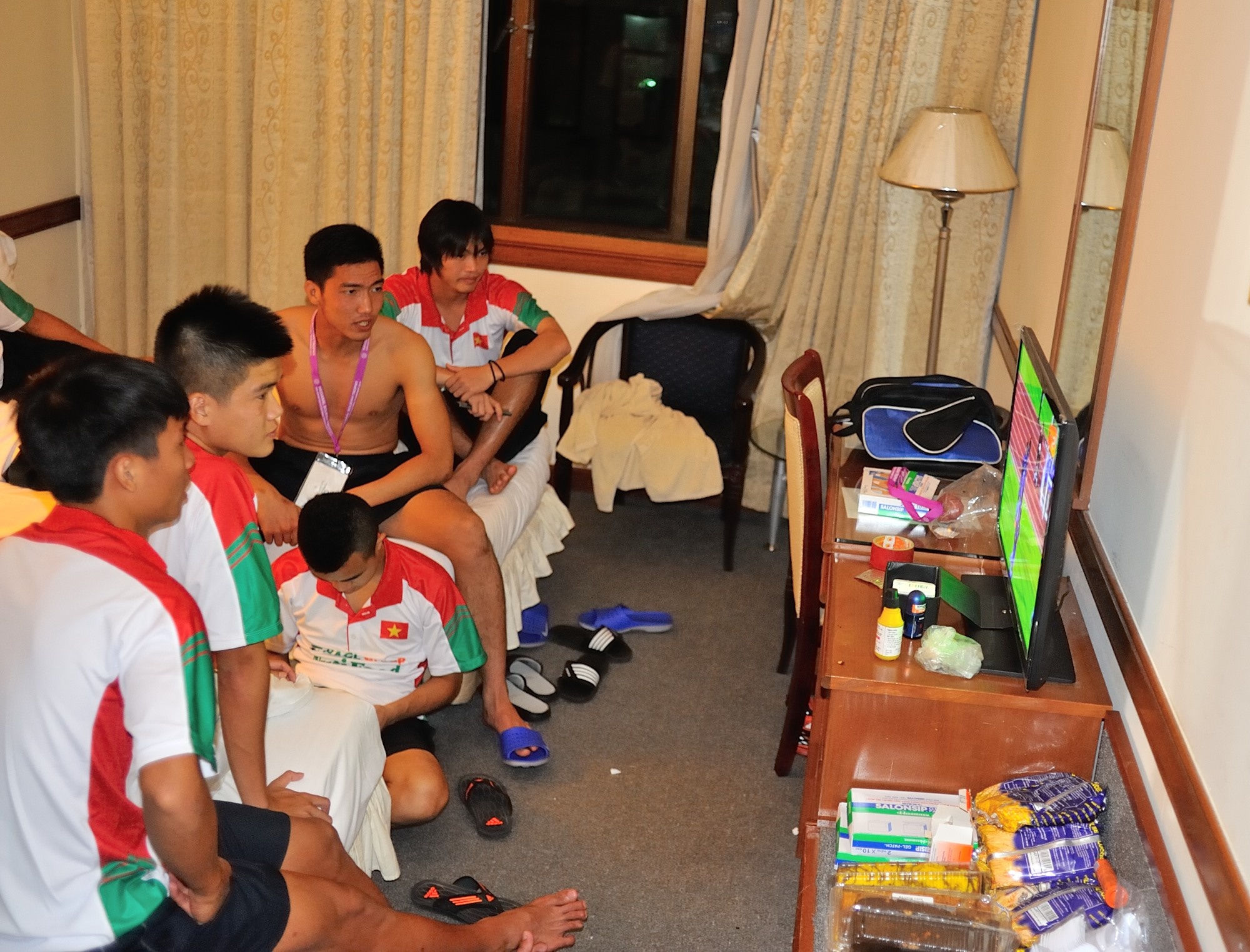 | Một nhóm cầu thủ khác tập trung tại phòng của bác sĩ Hoàng Nghĩa Dương để theo dõi trận đấu giữa đội chủ nhà Brunei với Campuchia. |