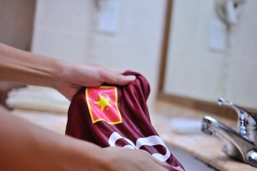 | Sau trận thắng Singapore, các cầu thủ U19 Việt Nam phải tự gom quần áo thi đấu tìm chỗ giặt khi khách sạn Grand City nơi đội tuyển đóng quân không hỗ trợ dịch vụ này. Còn lại đồ tập, đồ mặc lúc khởi động, đồ cá nhân hàng ngày các cầu thủ phải tự giặt và phơi trong phòng của khách sạn. |