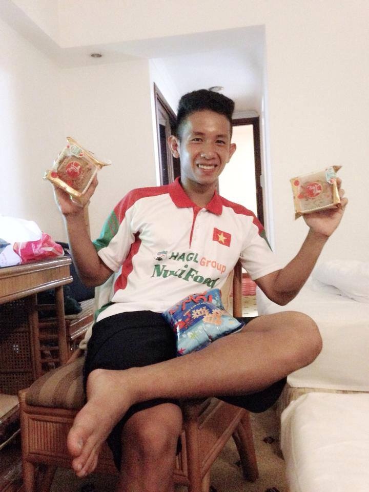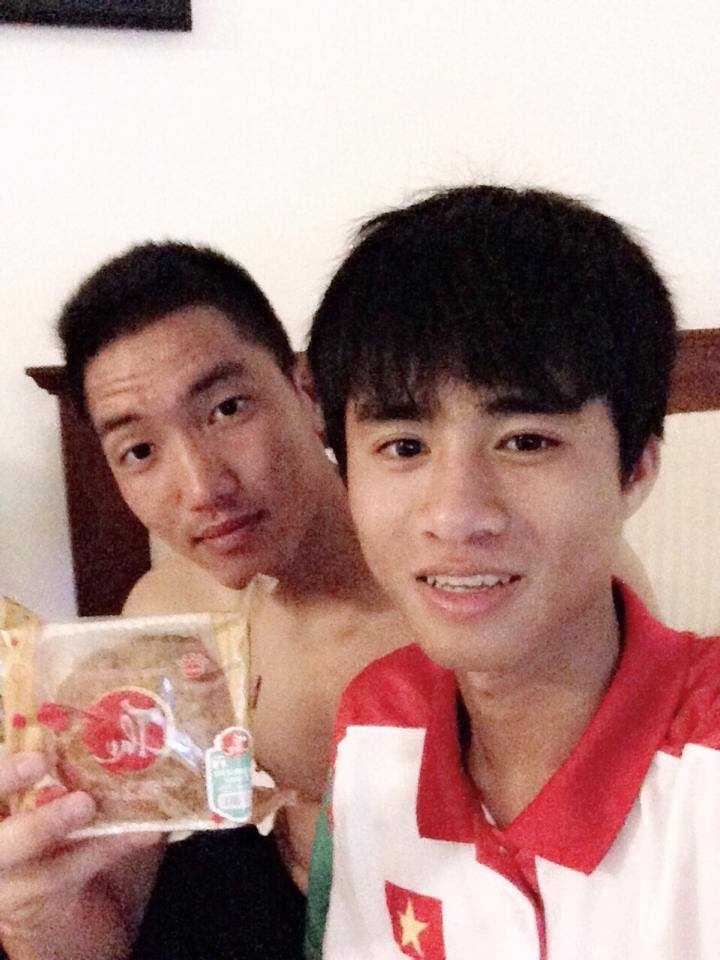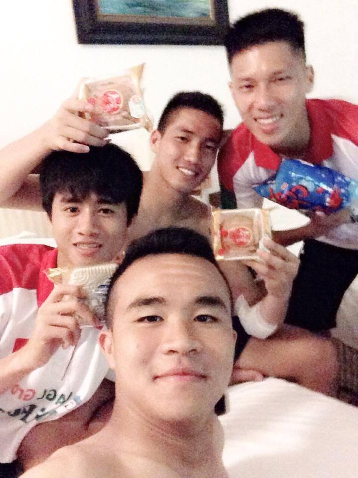 | Tiền vệ Thanh Hậu (trước) và thủ môn Văn Trường khoe chiếc bánh trung thu ngay trong phòng khách sạn. Các cầu thủ trẻ vẫn tò mò vì chưa được xem đường phố Hà Nội nhộn nhịp trước ngày rằm tháng tám. |