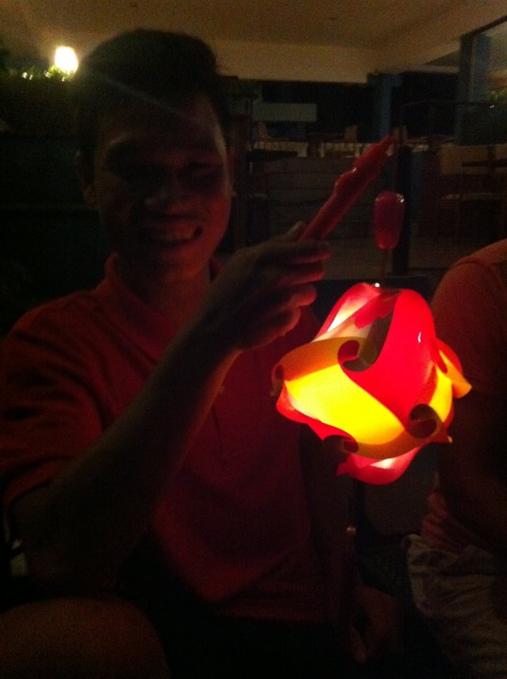 | Đông Triều tỏ ra thích thú với đèn lồng có kiểu dáng lạ mắt. Trung vệ gốc Quảng Nam vốn quen thuộc với đèn lồng bằng giấy truyền thống ở quê nhà gần phố cổ Hội An. |