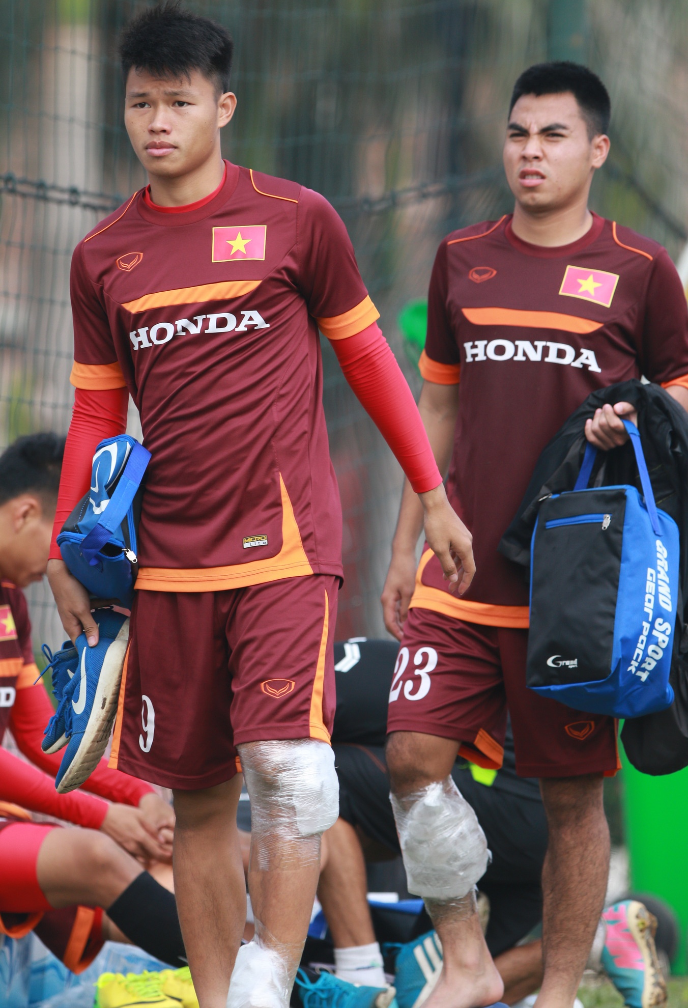 Kết thúc buổi tập, hàng loạt cầu thủ đá chính Duy Khánh, Đức Huy hay Hữu Dũng... phải rời sân với túi đá lớn chườm ở khu vực chấn thương.