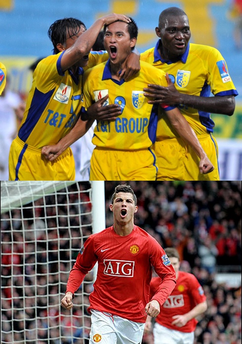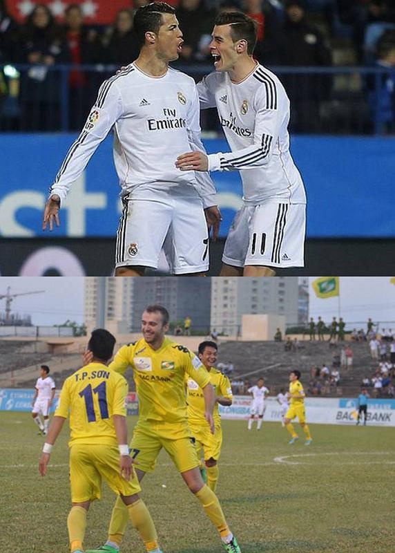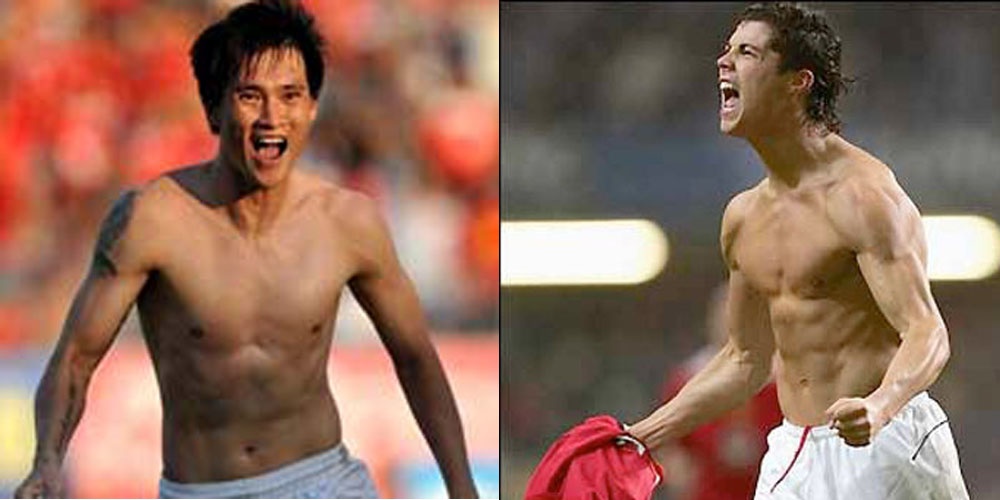 Trong trận chung kết Champions League vừa diễn ra giữa Real Madrid và Atletico Madrid, Ronaldo gây ấn tượng mạnh bằng pha ăn mừng khoe cơ bắp. Cựu trung vệ đội tuyển Việt Nam Lê Quang Trãi góp vui trên facebook của anh bằng hình ảnh ăn mừng khi còn khoác áo HAGL đặt cạnh của siêu sao người Bồ Đào Nha.