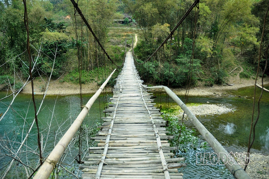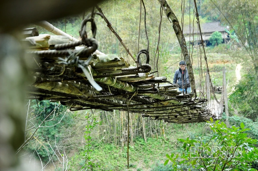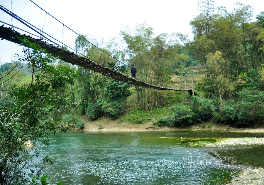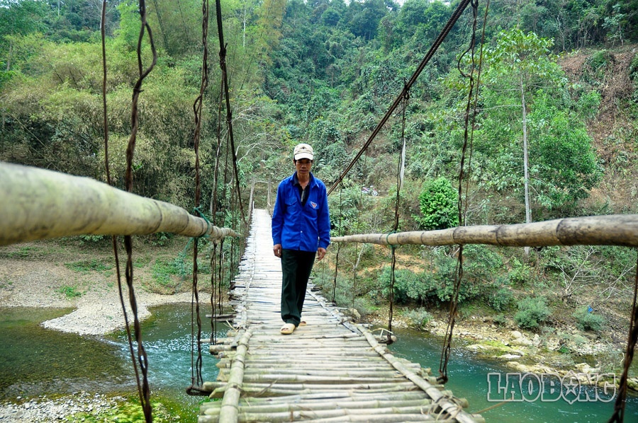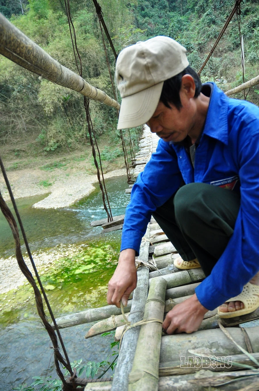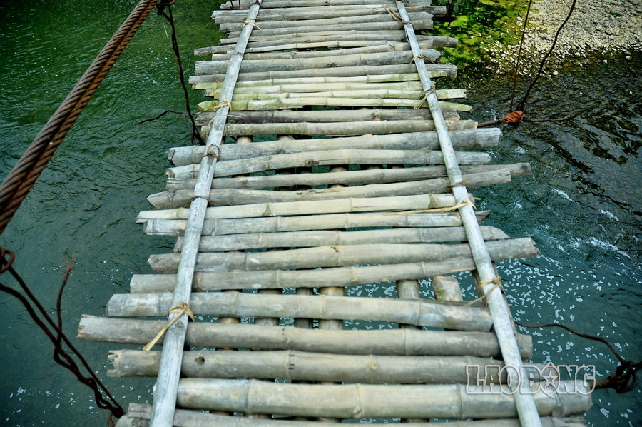 | Đó là chiếc cầu được làm bằng những thanh tre ghép lại với nhau và buộc chắc chắn bằng những chiếc lạt mỏng bắc qua sông Nguyên Bình của anh Triệu Văn Lãm (44 tuổi). |