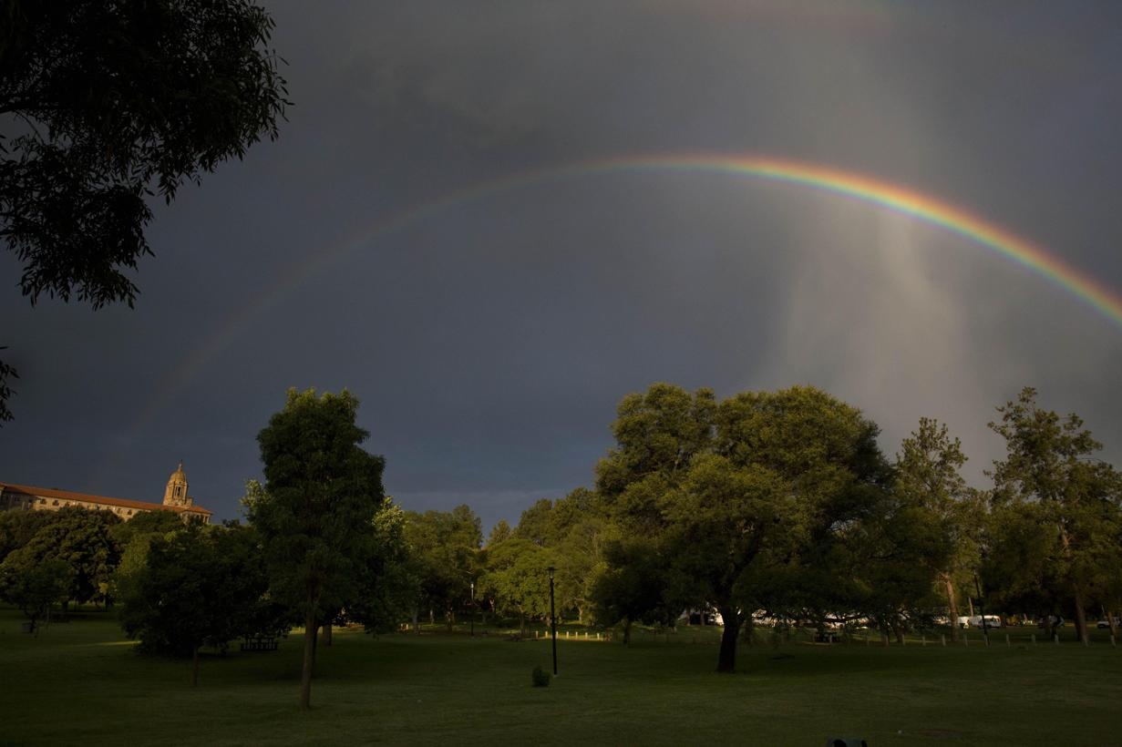 Cảnh tượng cầu vồng từ góc nhìn gần tượng của Louis Botha, vị thủ tướng đầu tiên của Nam Phi, tại Pretoria hôm 12/12. Ảnh: AP