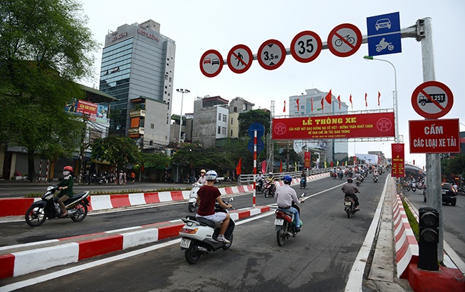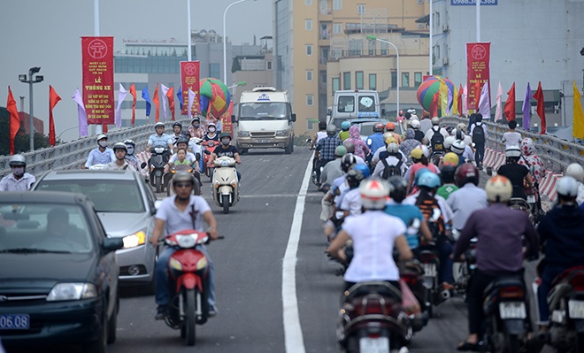 Những chiếc xe đầu tiên đi qua cầu, mở màn cho việc giải phóng tình trạng ùn tắc thường xuyên diễn ra ở ngã tư Đại Cồ Việt - Bạch Mai.