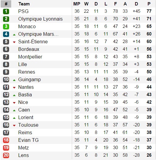 | Bảng xếp hạng vòng 36 Ligue 1. |