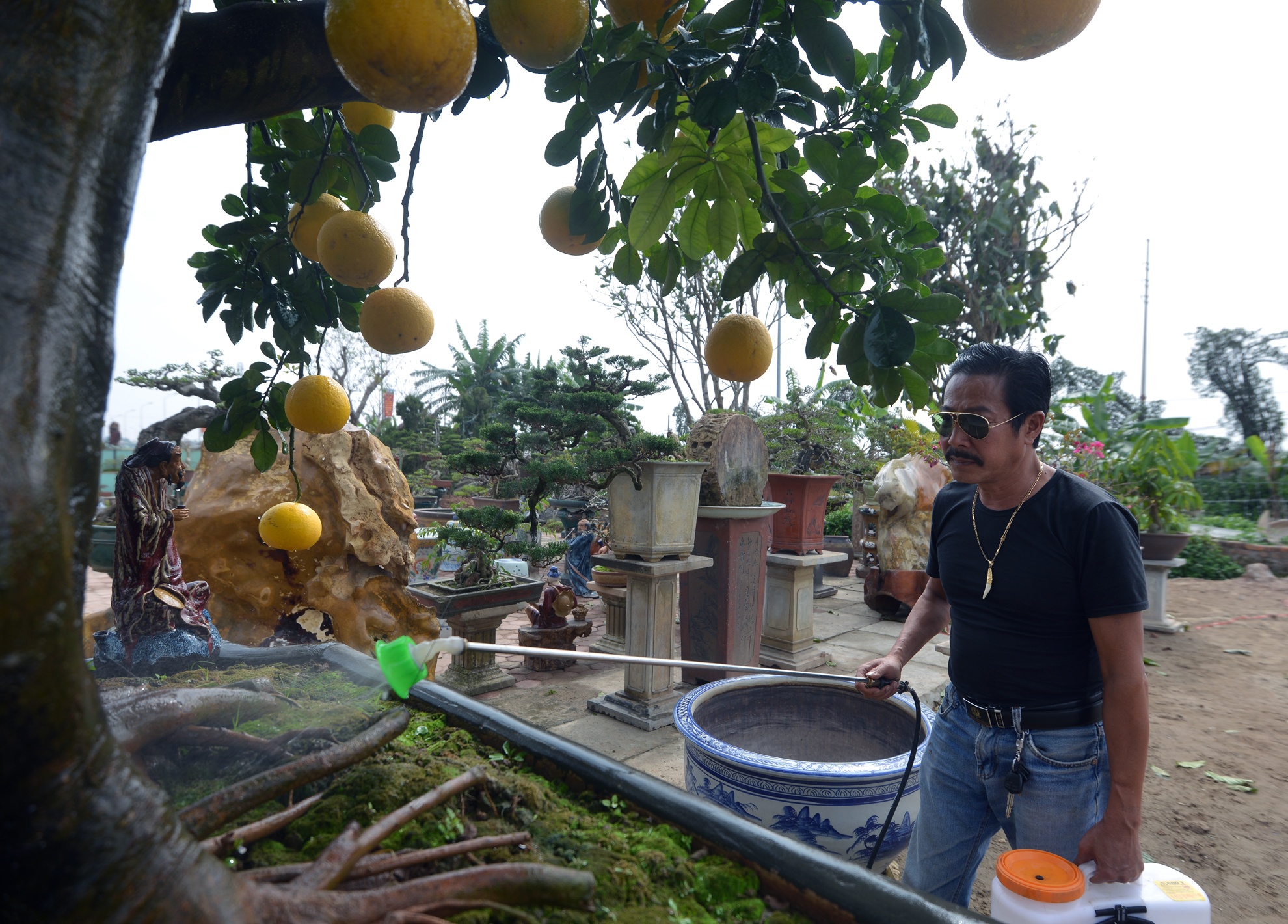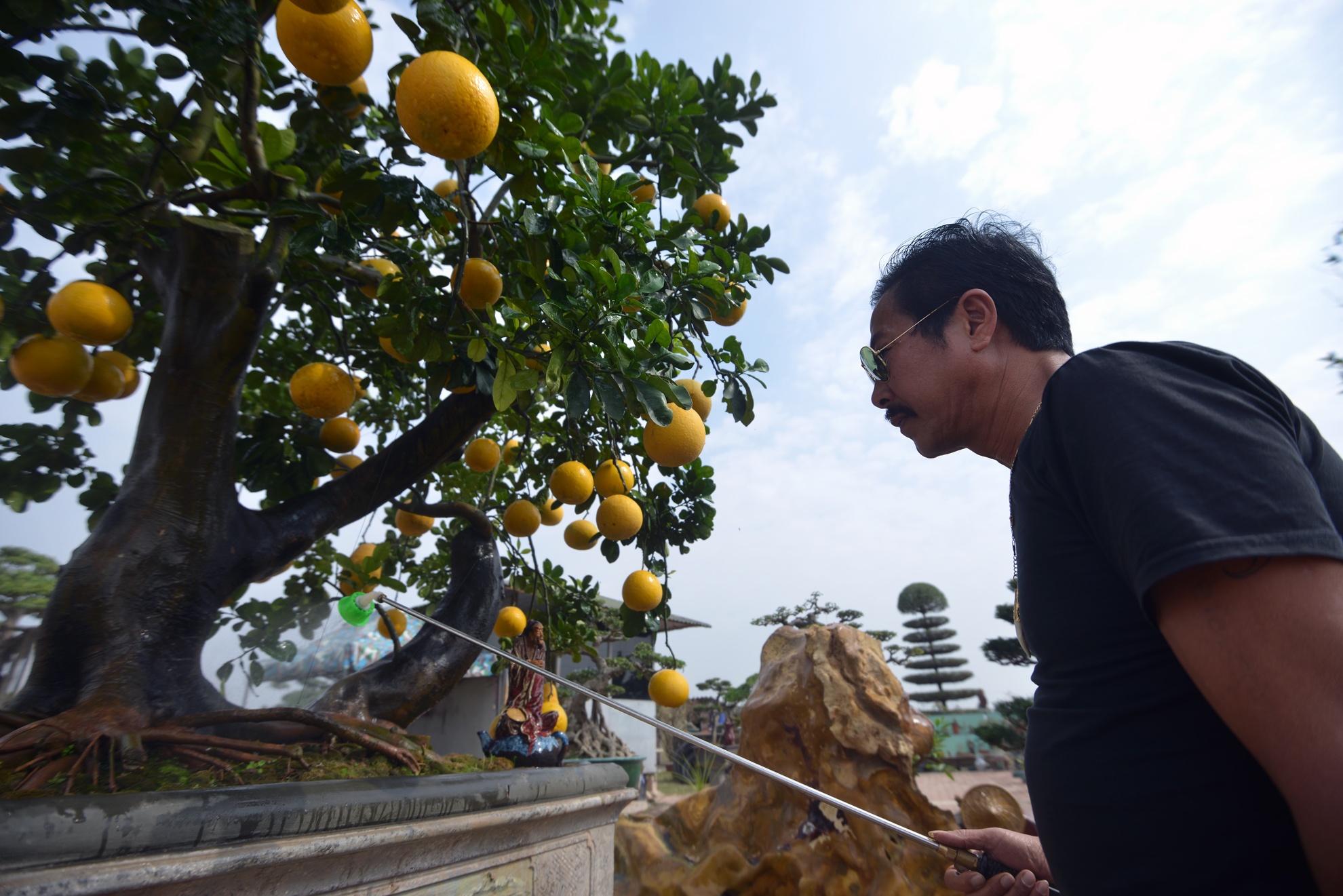 Ông Hùng cho biết dành cho chậu cây này chế độ chăm sóc đặc biệt. "Với thời tiết nóng lạnh thất thường như hiện nay thì chế độ tưới nước và chăm sóc phải hết sức cẩn thận. Từ giờ đến Tết, chỉ cần một quả bưởi rụng xuống là coi như mất đi một nửa giá trị của cây", ông nói.