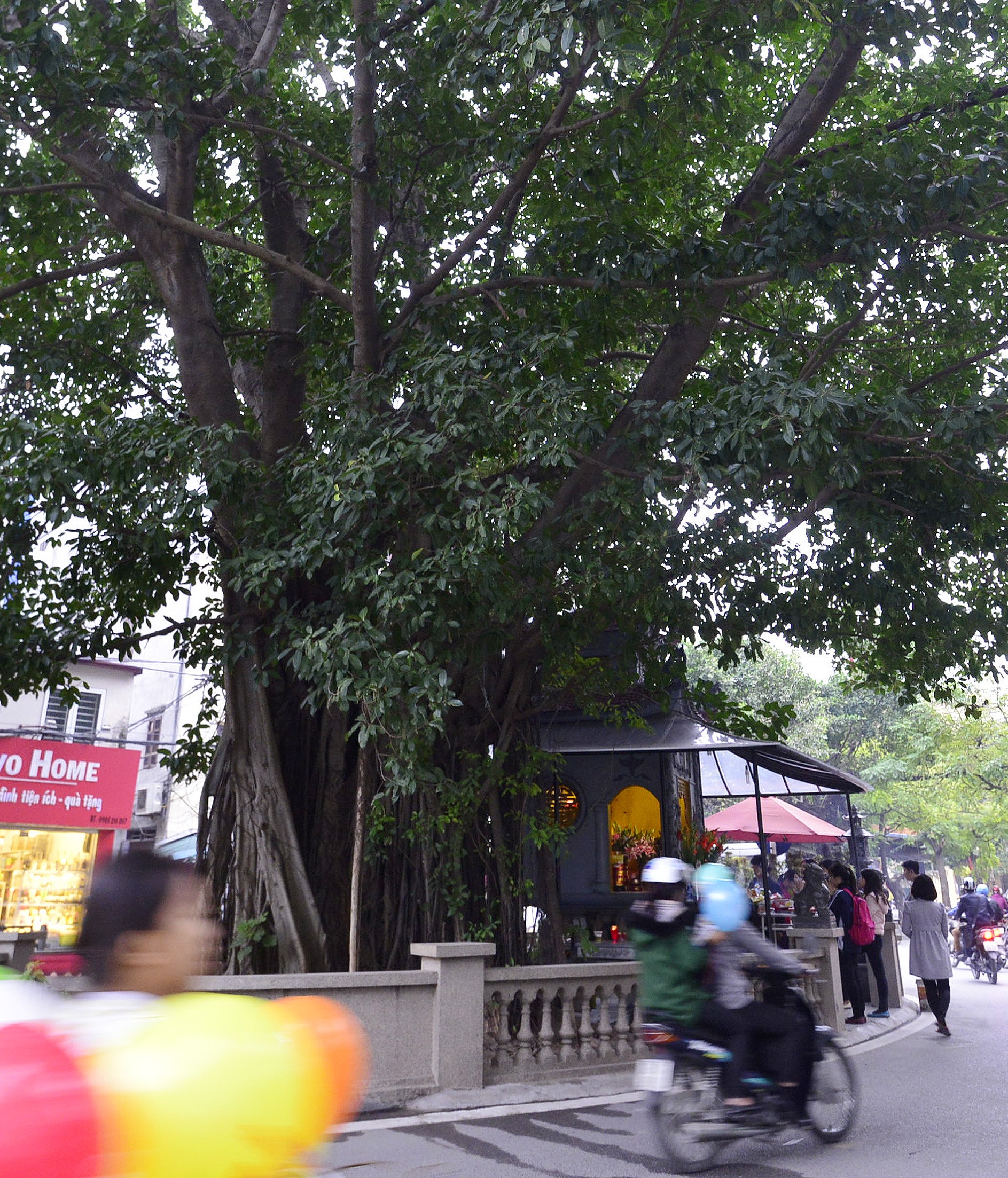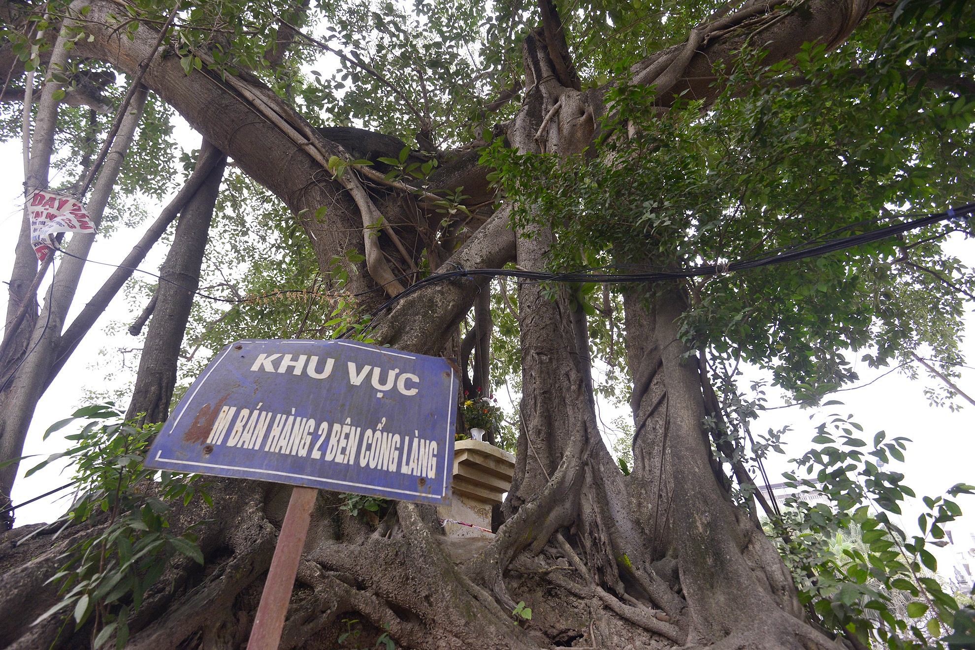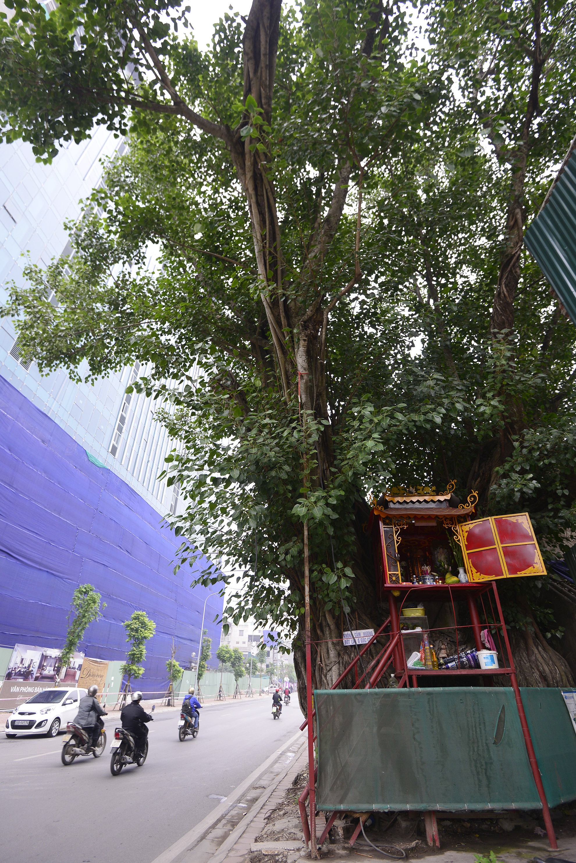 | Một ban thờ do người dân sống quanh vùng đặt lên cao có giá đỡ kiên cố. Đại diện tổ dân phố số 13 (phường Điện Biên) cho biết, cây đa đã trở thành một phần tín ngưỡng của người dân nên đã yêu cầu đơn vị thi công không được chặt bỏ. |