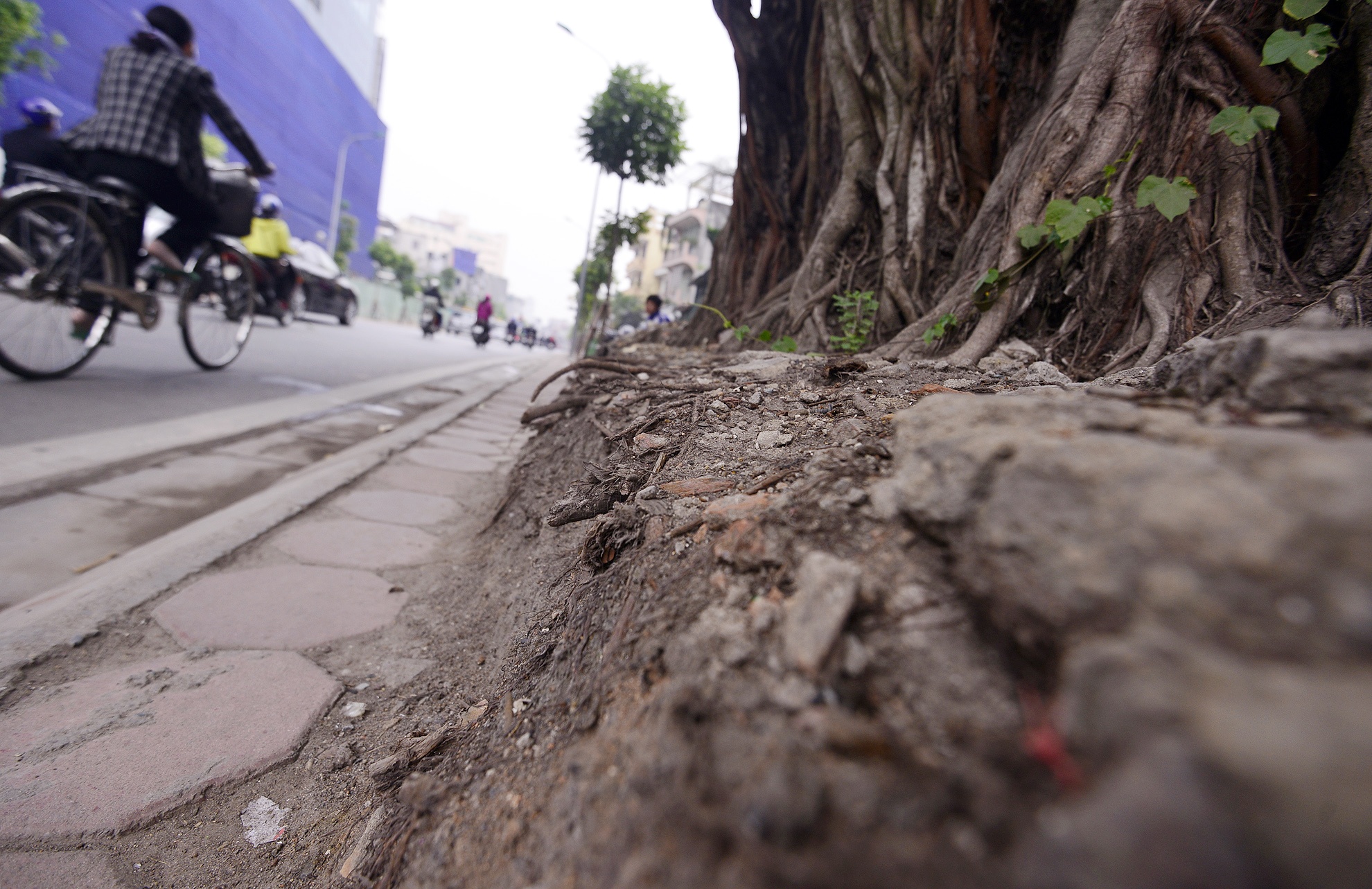 | Phần rễ chính của cây cũng được cắt bớt, dành một lối nhỏ cho người đi bộ có thể qua lại. Tuy nhiên, vỉa hè không còn. |