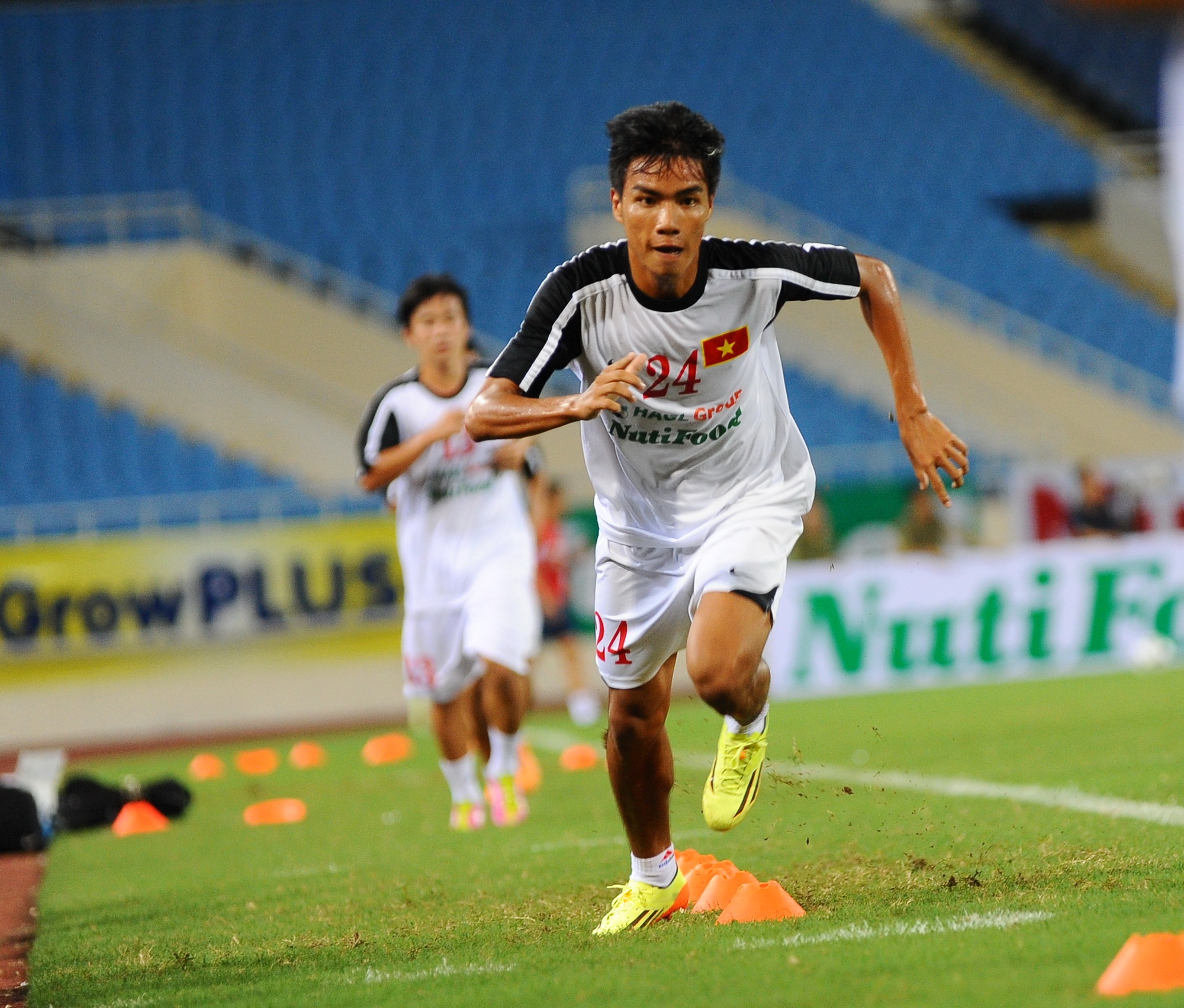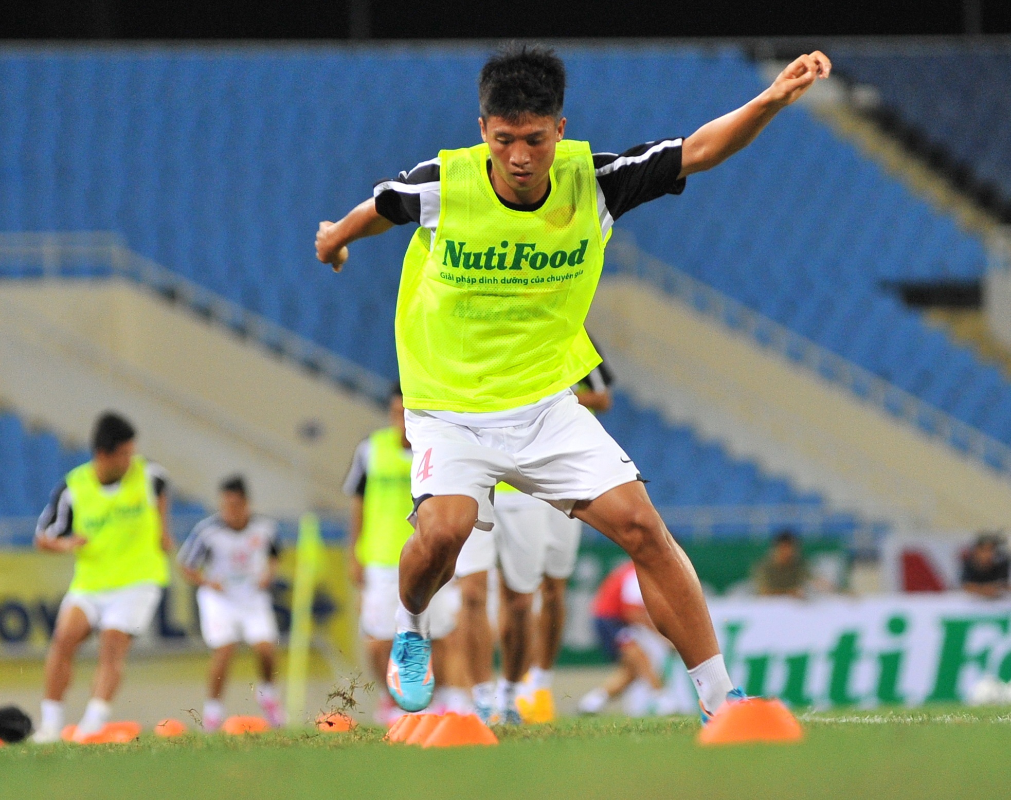 | Trung vệ Tiến Dũng trong bài tập chạy đổi hướng vượt qua các chướng ngại vật. |