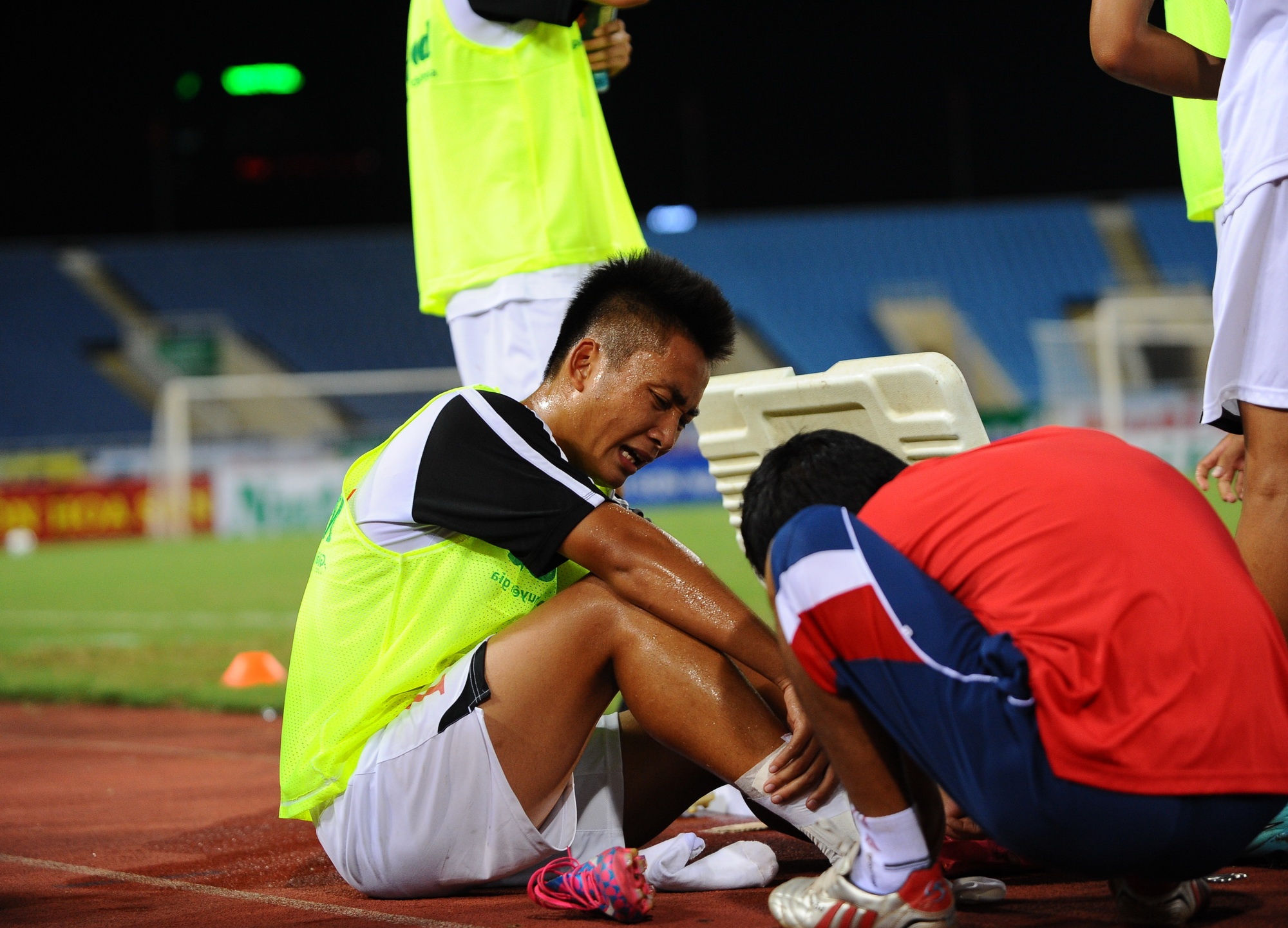 | Sau bài tập chạy khởi động, tiền đạo Hồ Tuấn Tài bị đau nhẹ và cần tới sự chăm sóc của bác sĩ trước khi tiếp tục nuốt trọn giáo án của BHL ở bài tập chiến thuật. |