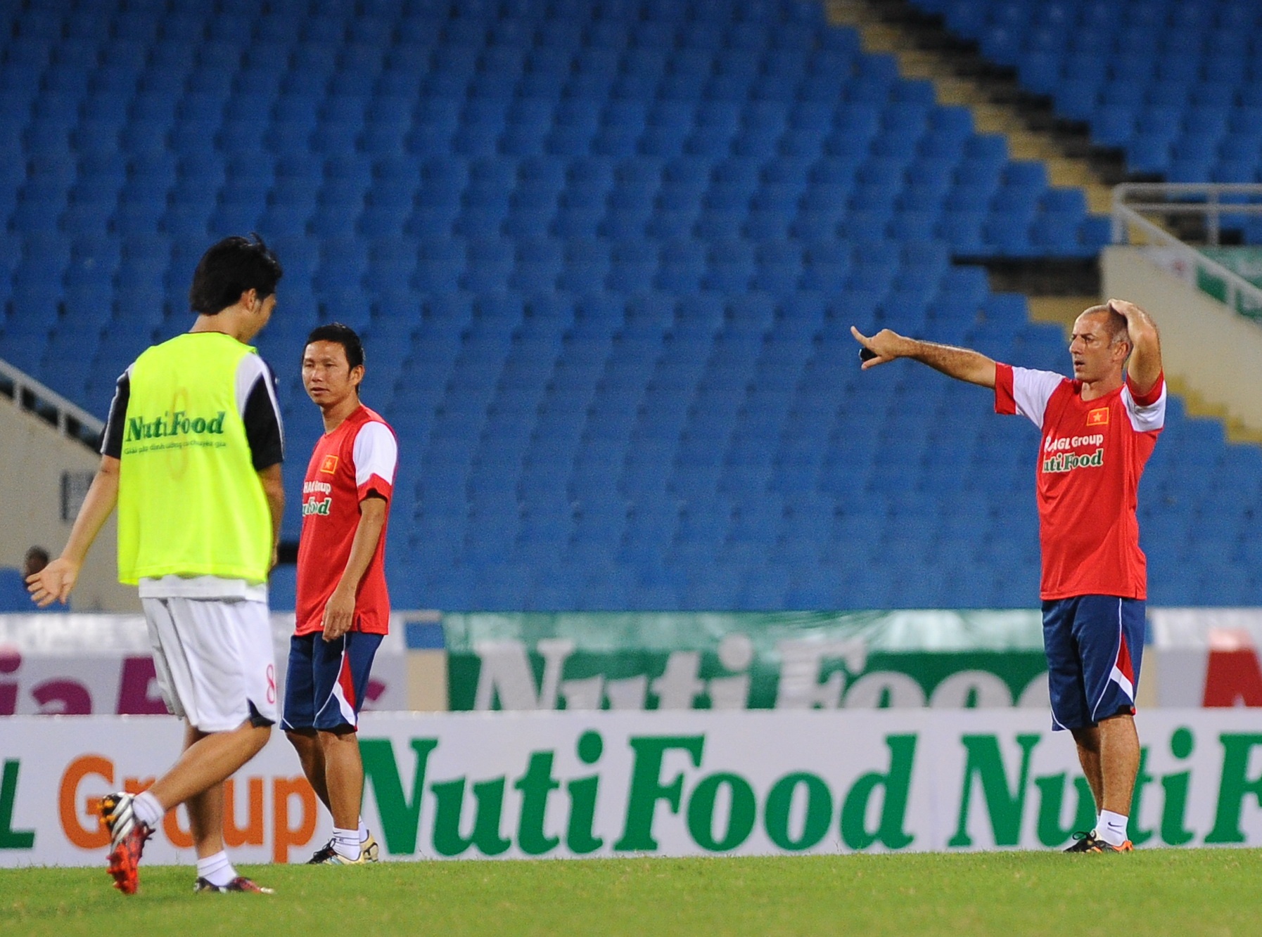 | HLV Guillaume Graechen hướng dẫn và nắn chỉnh từng vị trí di chuyển của các học trò ở bài tập đá đối kháng chiến thuật. |