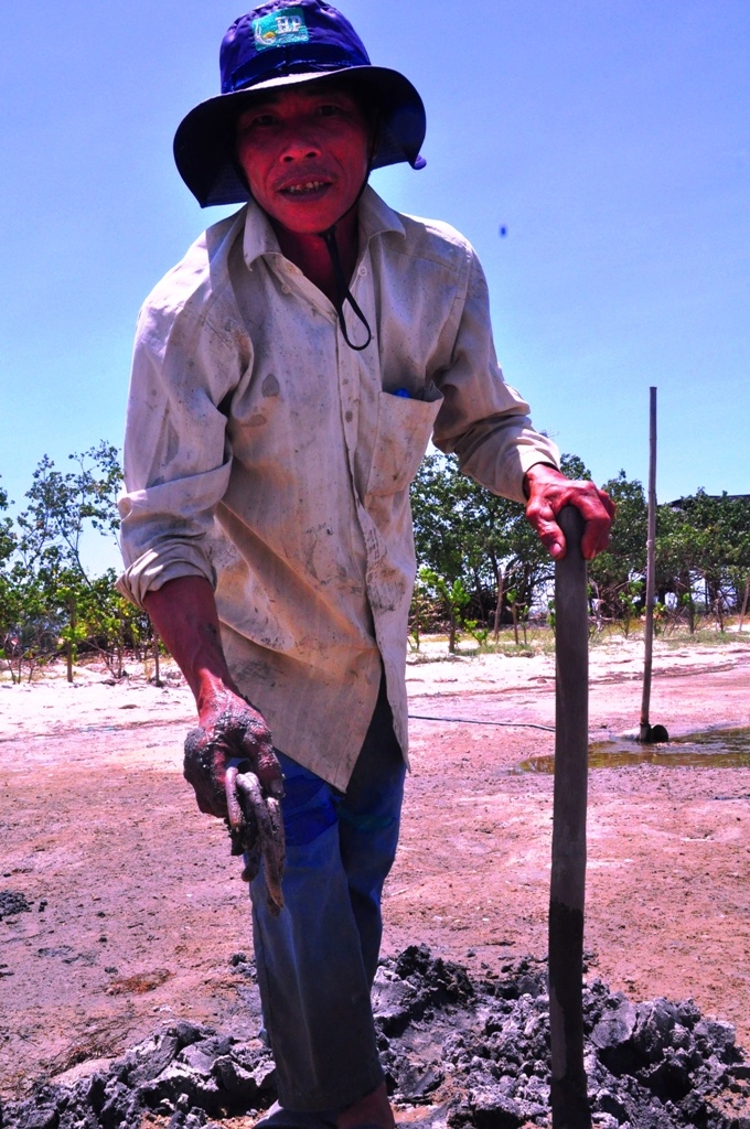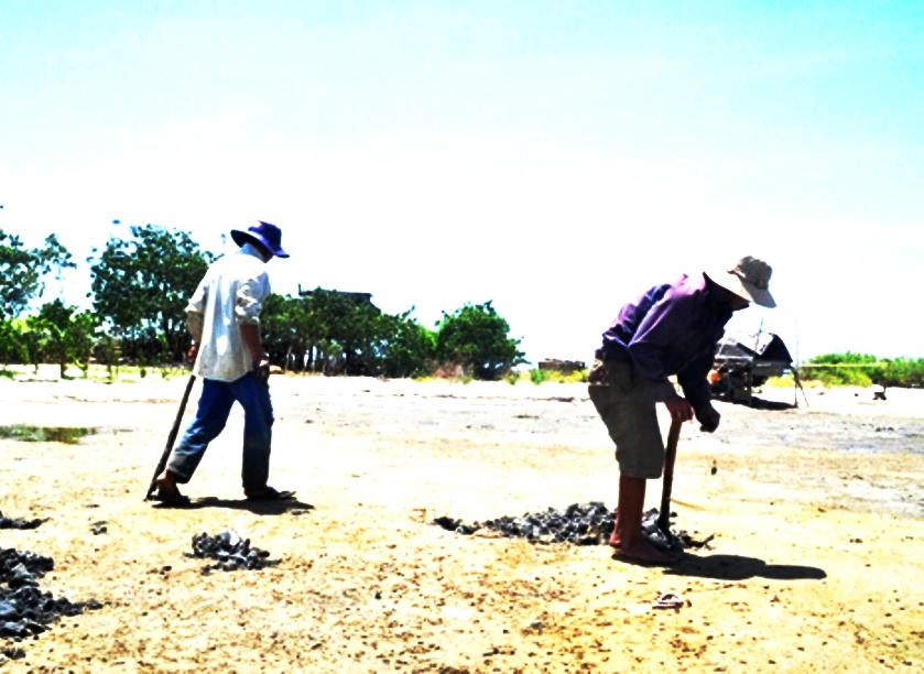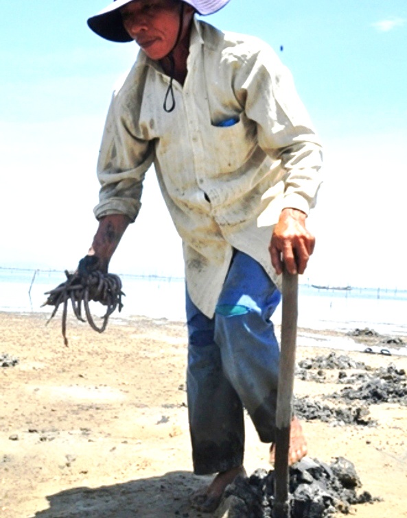 | Mặc cho cái nắng như thiêu như đốt, nhưng nhiều người vẫn tích cực đào xới tìm giun. Họ thường ra biển vào giữa trưa, lúc này thủy triều rút để lộ các hang trú ẩn của địa sâm trên cát. |