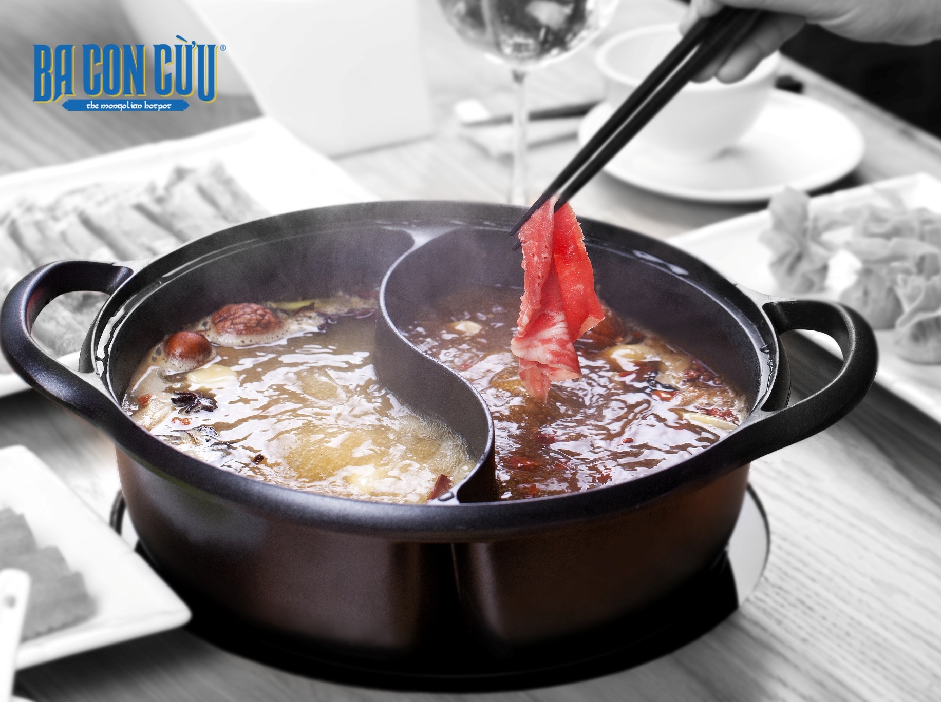| Nồi lẩu cừu non Mông Cổ tại nhà hàng Ba Con Cừu gồm 2 vị thanh ngọt và cay nồng với các loại thảo quả và gia vị thảo nguyên vùng Trung Á, giúp kích thích cả vị giác lẫn khứu giác nhờ mùi thơm nồng nàn và hương vị đặc sắc. |