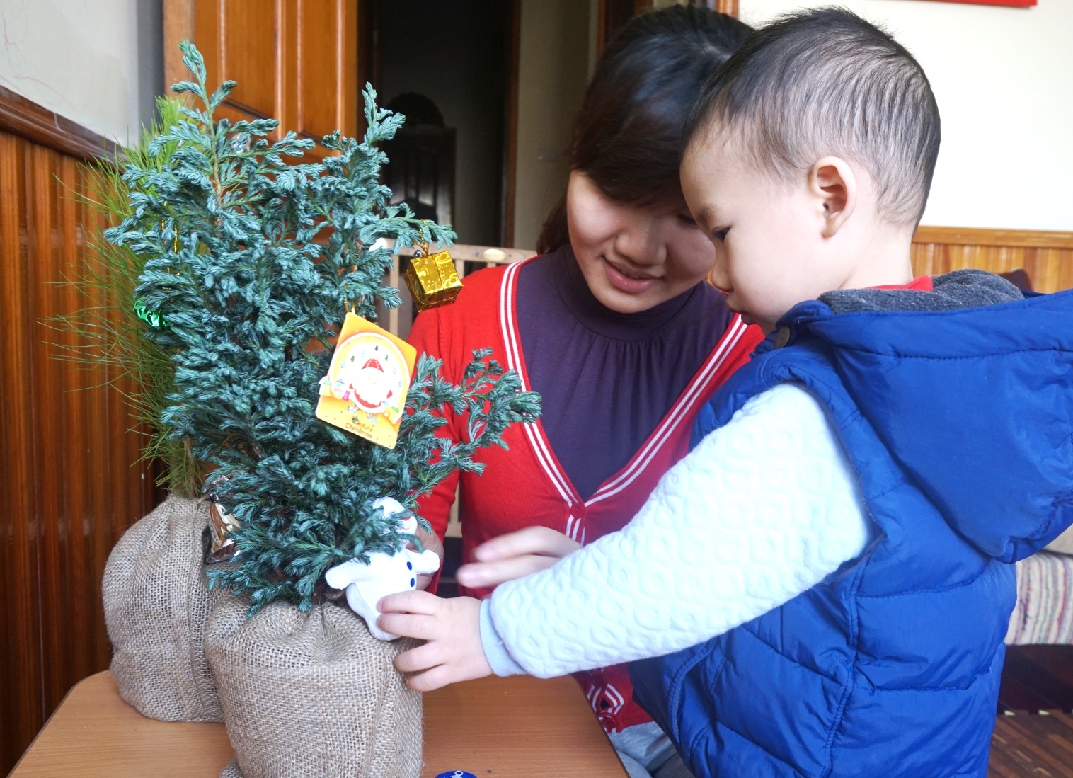 Không chỉ hấp dẫn khách lớn tuổi, các cây Noel mini còn khiến nhiều em bé say mê.Cậu con trai hơn 2 tuổi của chị Vân Hương rất thích được cùng mẹ chăm sóc và trang trí cây, gói quà trước khi chuyển đến tay khách. Giá cây thành phẩm sau khi trang trí thường chênh so với giá bán thông thường khoảng 50.000 - 100.000 đồng/cây.