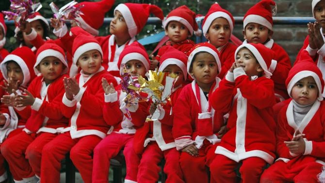 | Các em nhỏ mặc trang phục "ông già Noel", tham dự lễ đón Giáng sinh tại một trường học tại Jammu, Ấn Độ, hôm 24/12. Số lượng người Kito giáo chiếm khoảng 2% dân số Ấn Độ. Ảnh: AP |
