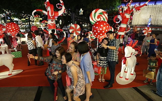 Người dân Singapore đang đắm chìm trong bầu không khí rộn ràng khi tham gia các sự kiện chào đón Noel và Năm mới 2015 trên đường Orchard Road. Ảnh: Straitstimes