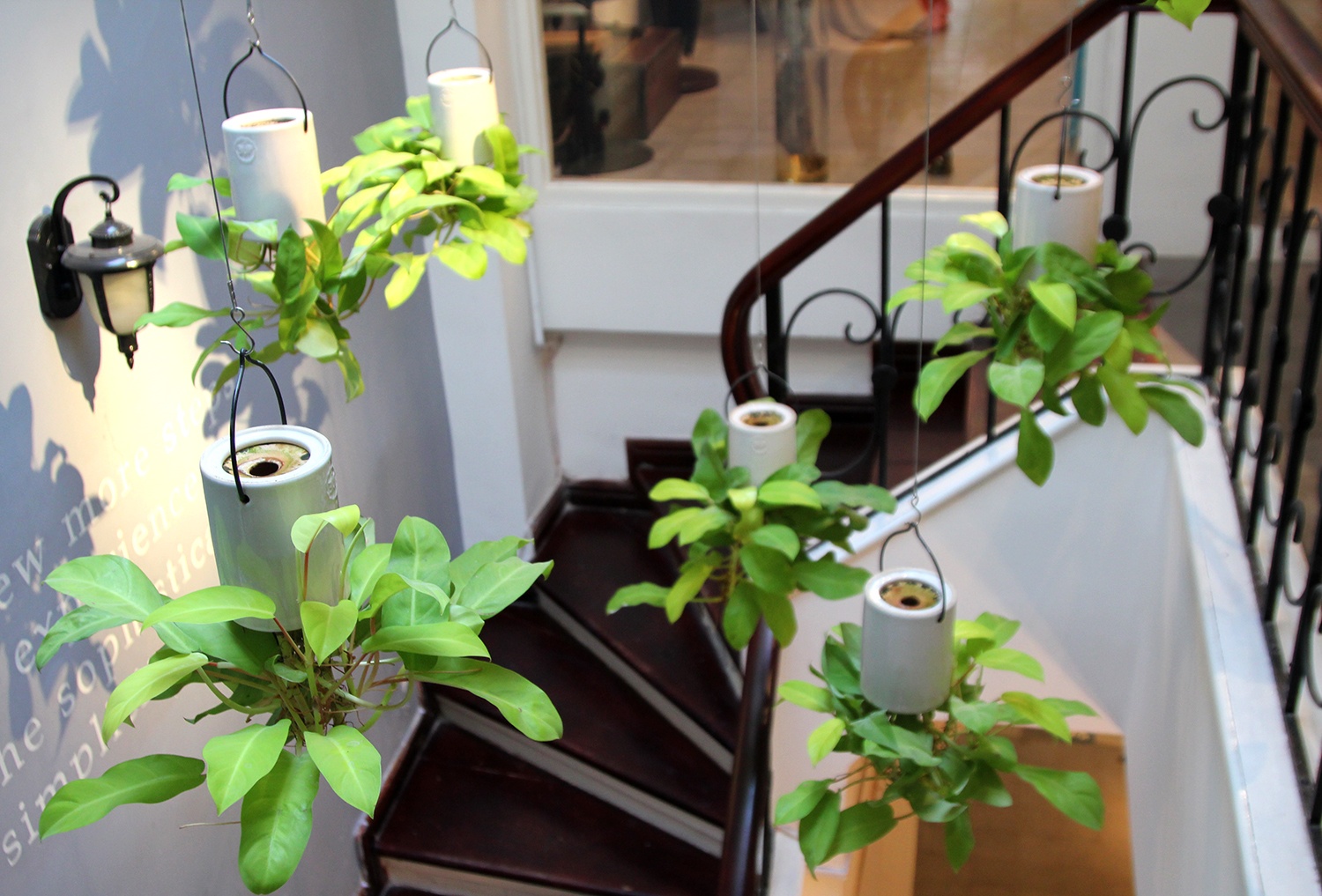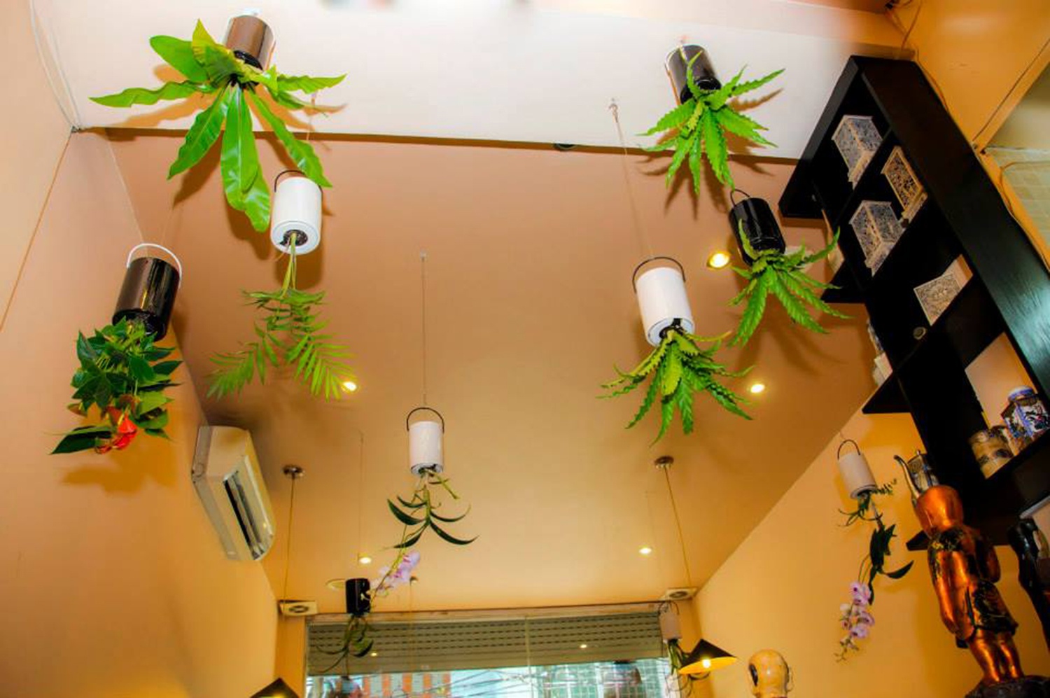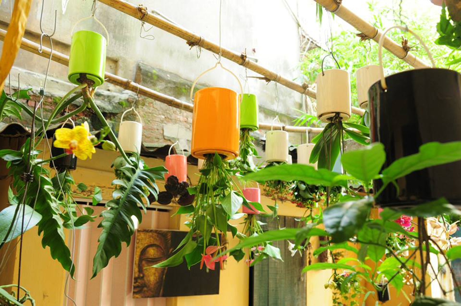 | Nhiều nhà còn treo trực tiếp những chậu hoa úp ngược lên trần để trang trí, tạo nên một không gian ấn tượng, có cảm giác như những chậu cây mọc ngược trên trần. |