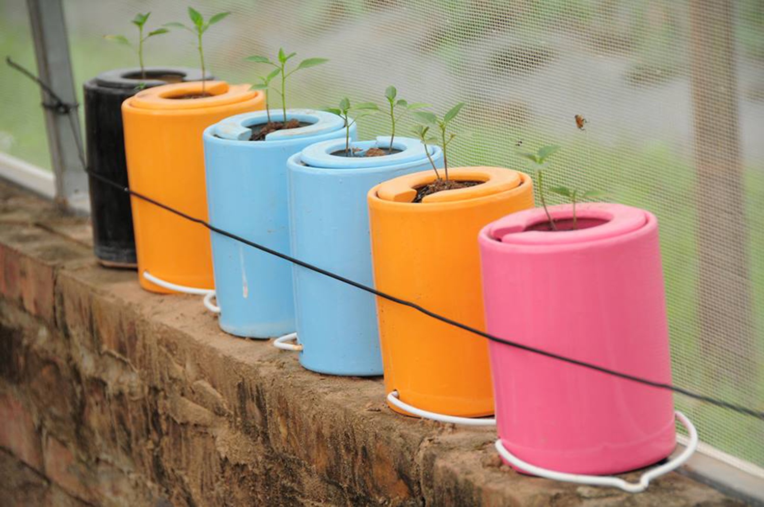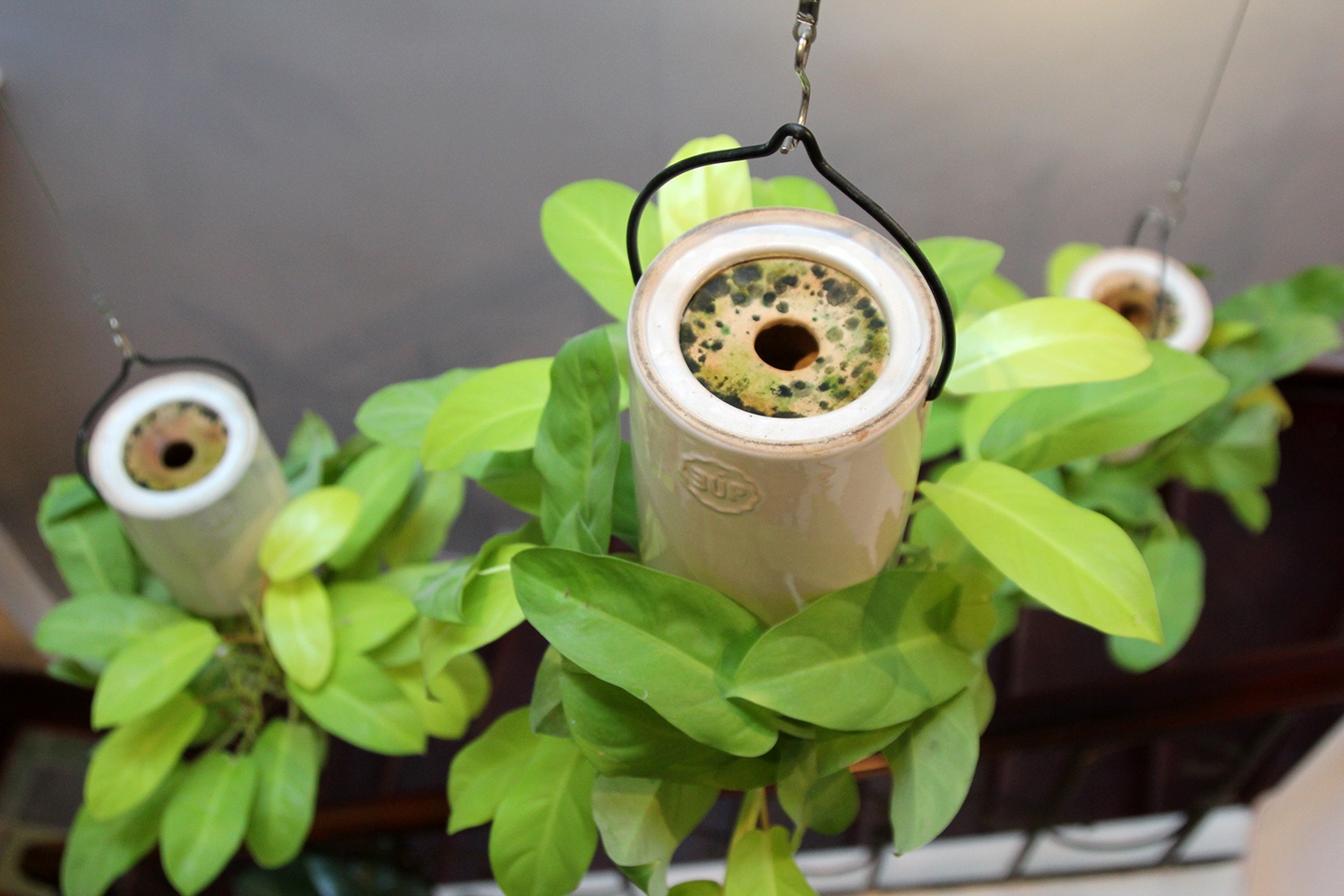 | Trên chậu hoa úp ngược có một bầu chứa nước bằng sứ thẩm thấu để cung cấp nước cho cây, và phải mất 3 ngày cây mới tiêu thụ hết số nước trong bầu. Những loại phân bón cũng được pha chung với nước để cung cấp chất dinh dưỡng cần thiết cho cây. |