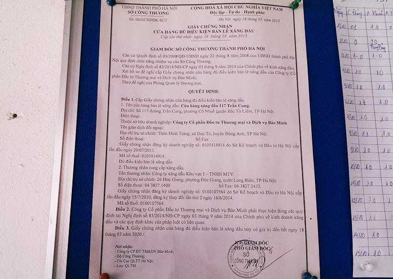 | Giấy phép hoạt động của cây xăng 117 Trần Cung được cấp bởi Sở Công Thương dán trong nhà. Ảnh: Ngọc Lan. |