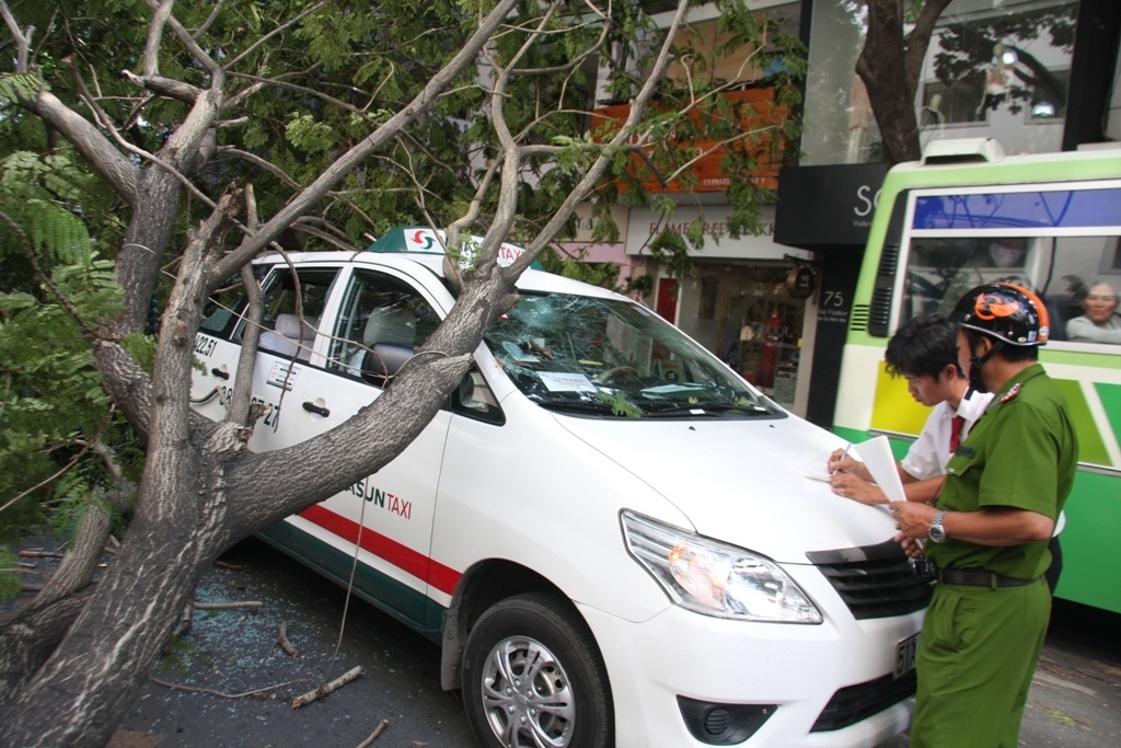 Anh Mai Uy Tín (30 tuổi, tài xế taxi) cho biết, lúc đó xe không có khách và đang dừng đèn đỏ tại giao lộ Lê Thánh Tôn. "Khi nghe người dân hô hoán cây ngã tôi không chạy kịp vì phía trước rất đông xe đang dừng nên xe bị nhánh cây đập vỡ kính, tôi may mắn không sao", anh Tín cho biết thêm.