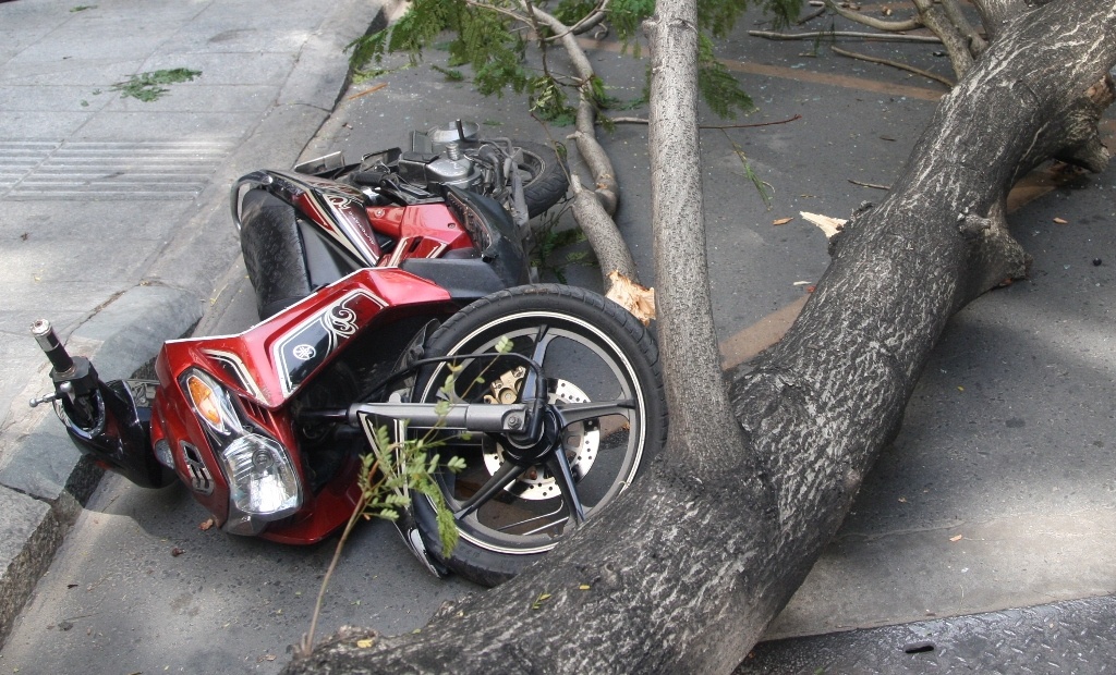 Cây xanh lại đổ đè taxi và xe máy đang đừng đèn đỏ