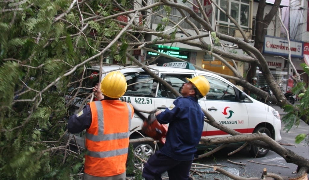 Vụ việc khiến giao thông trên đường Pasteur ùn tắc, các công nhân công ty công viên cây xanh đến cắt cây để giải tỏa giao thông.