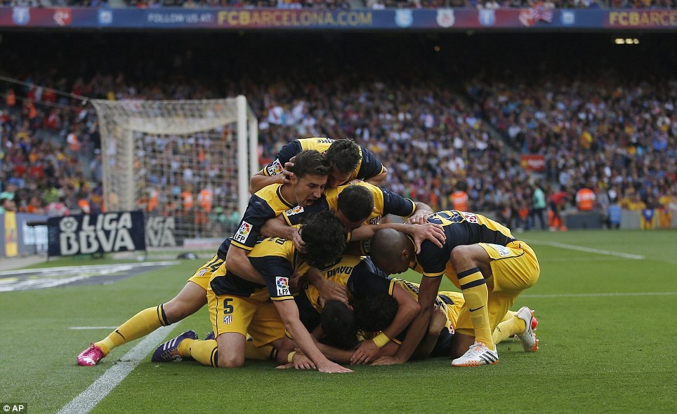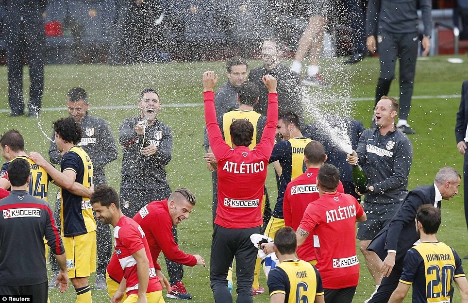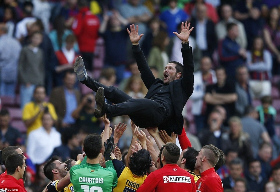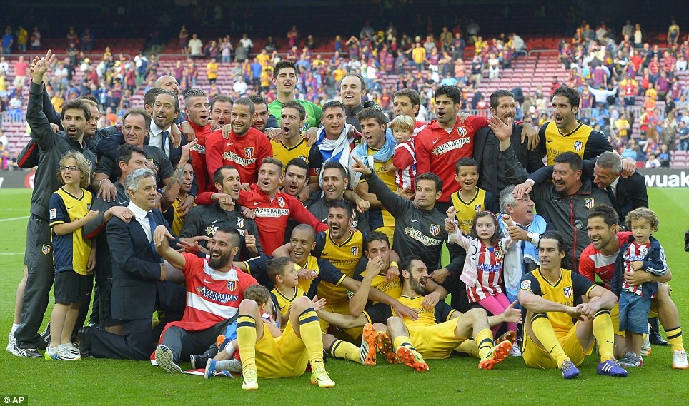 | Ban huấn luyện và cầu thủ Atletico ăn mừng chức vô địch ngay trên sân Nou Camp (Barca). |
