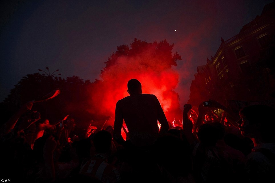 | Hàng nghìn người hâm mộ Atletico Madrid đổ xuống đường mừng chiến tích lịch sử của thầy trò HLV Simeone. |