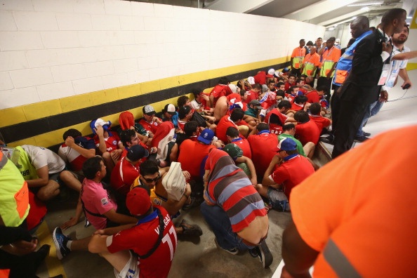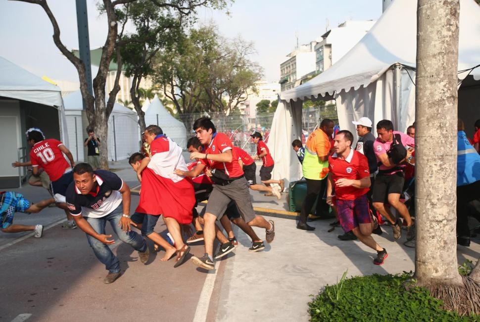 Trước cuộc thư hùng với Tây Ban Nha, hơn 100 fan hâm mộ Chile tìm cách vào sân Maracana bằng cách đập phá cửa kính, hàng rào trung tâm báo chí.